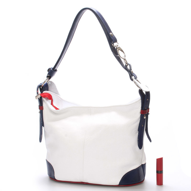 Najpredávanejšia kožená kabelka v kamenných obchodoch! Biela elegantne športová menšia kožená kabelka ItalY . Mäkká koža v tvare vaku sa ľahko prispôsobí vášmu noseniu. Kabelka pojme všetky každodenné potrebné veci. Má nastaviteľné ucho a možno ju nosiť aj crossbody. Hodí sa ku všetkým typom oblečenia. Zapína zipsom cez celú dĺžku, vo vnútri je jedno postranné vrecko na zips a dve bez zipsu, ďalej je delená ďalší vreckom na zips. Popruh predĺžite uvoľnením karabíny, vysunutím z oka úchytu a znova zaháknutím. Nemusíte teda nosiť so sebou ďalší popruh, kabelka je 2 v 1. Novinka 2016.