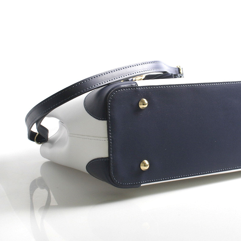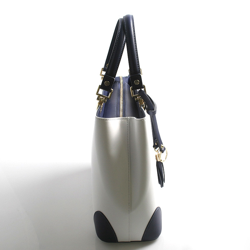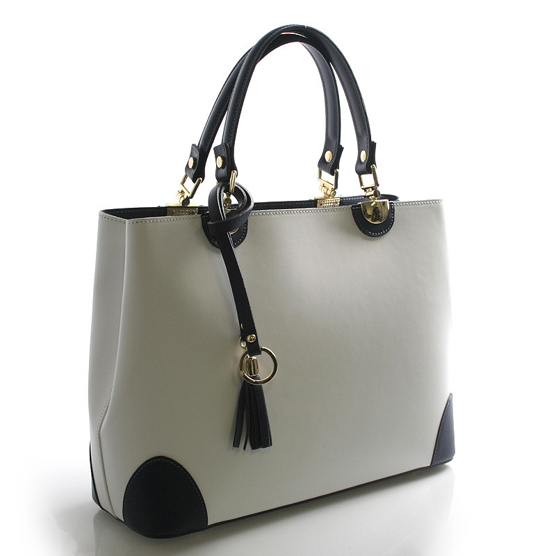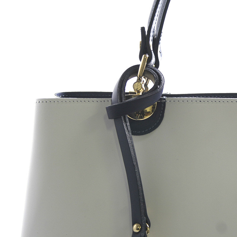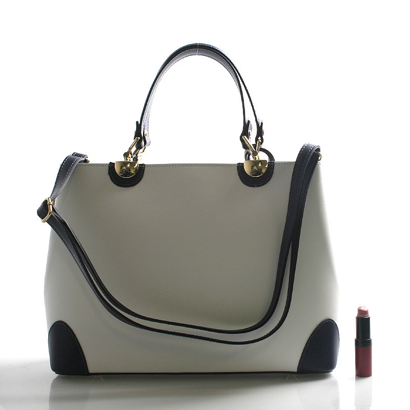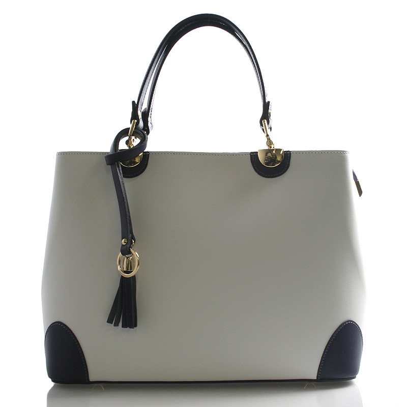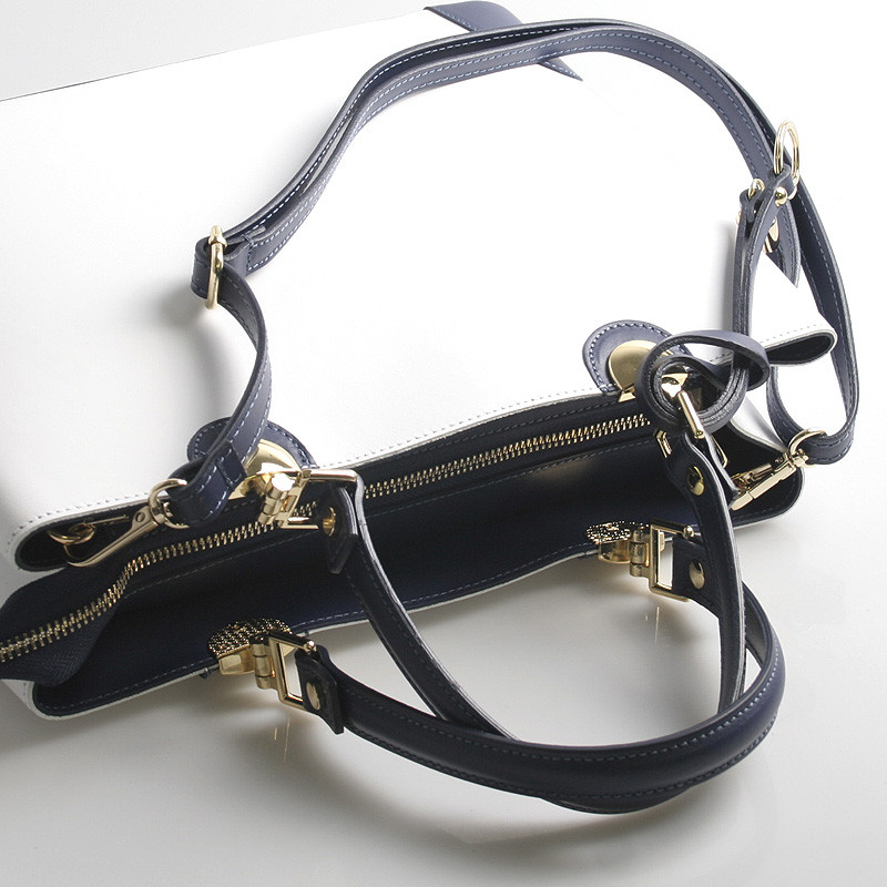 Biela luxusná kožená kabelka skôr do ruky ItalY s modrými detailmi. Elegantne riešená už jarno letná krásavica, ktorú si zamilujete. Zlaté kovanie je veľmi pôsobivé a ako doplnok je ku kabelke kožený prívesok. Zatváranie je na zips cez celú dĺžku kabelky, vo vnútri je delený priestor vreckom na zips a tri postranné vrecká na drobnosti. Ku kabelke možno pripnúť nastaviteľný popruh, kabelka je pevná, drží tvar. Novinka a bestseller 2016.