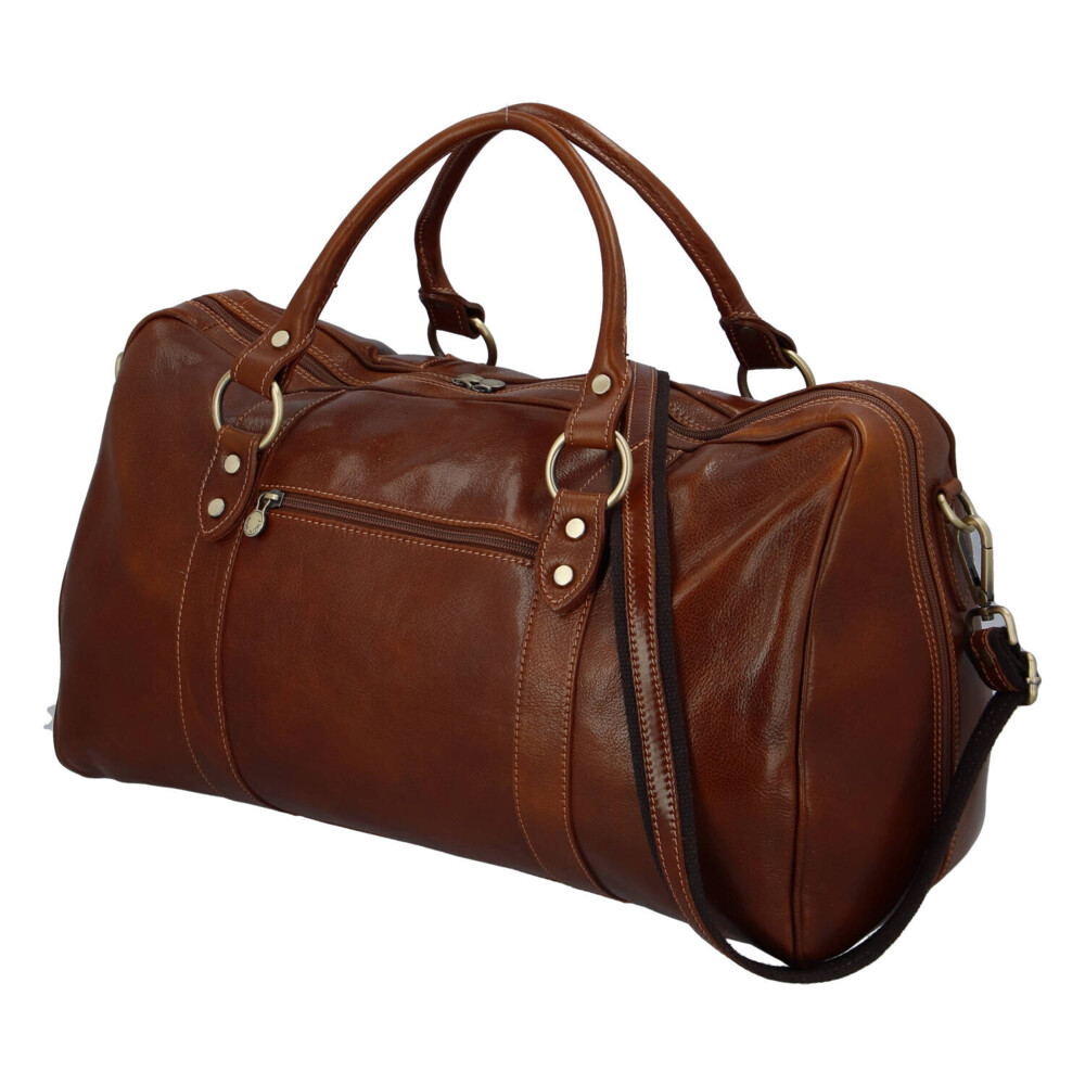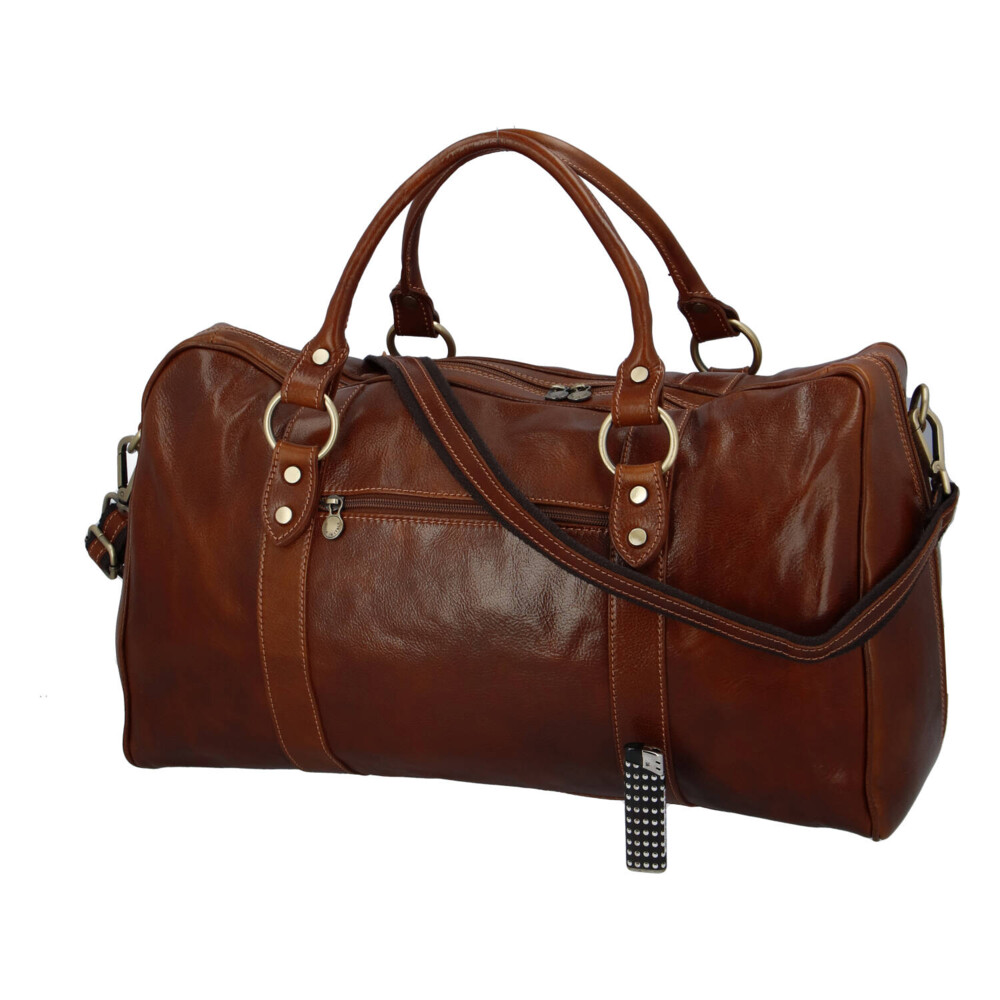 Kožená cestovná taška od značky Delami Vera Pelle. Elegantný a štýlový kúsok na pohodlné cestovanie. Taška je kvalitná, z pevnejšieho materiálu a veľmi priestranná s odnímateľným popruhom cez rameno. Pevné uchá skvele padnú do ruky. Je ušitá z hovädzej kože, takže vám bude poctivo a dlho slúžiť. Na dvoch vonkajších stranách ponúka dve vrecká so zipsom a vo vnútri využijete jedno veľké vrecko voľné a jedno so zipsom. Dno chráni kovové nožičky a mosadzné kovanie doladí tento luxusný kúsok. Objednajte ešte dnes a vyskúšajte, vrátiť ju môžete až za 30 dní!