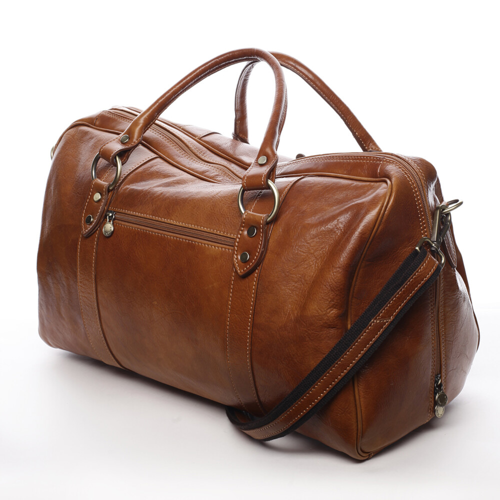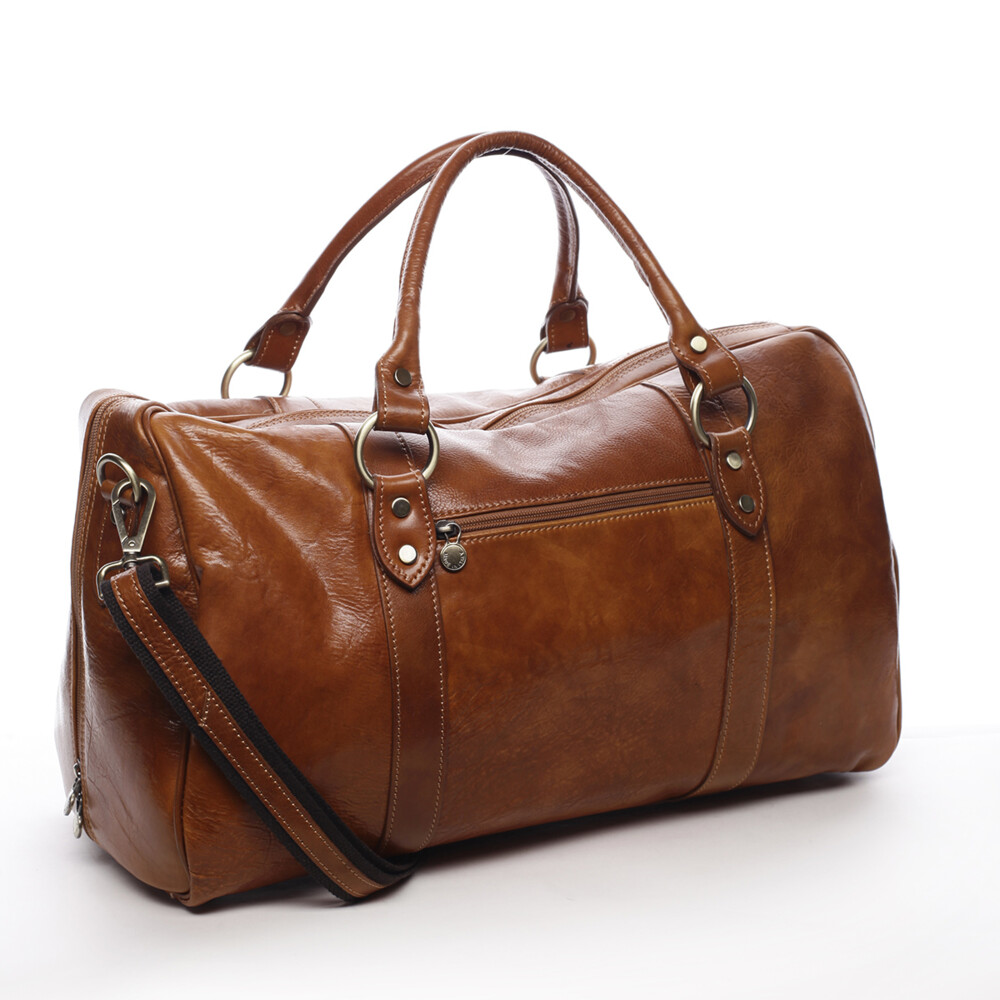 Kožená cestovná taška od značky Delami Vera Pelle. Elegantný a štýlový kúsok na pohodlné cestovanie. Taška je kvalitná, z pevnejšieho materiálu a veľmi priestranná s odnímateľným popruhom cez rameno. Pevné uchá skvele padnú do ruky. Je ušitá z hovädzej kože, takže vám bude poctivo a dlho slúžiť. Na dvoch vonkajších stranách ponúka dve vrecká so zipsom a vo vnútri využijete jedno veľké vrecko voľné a jedno so zipsom. Dno chráni kovové nožičky a mosadzné kovanie doladí tento luxusný kúsok. Objednajte ešte dnes a vyskúšajte, vrátiť ju môžete až za 30 dní!