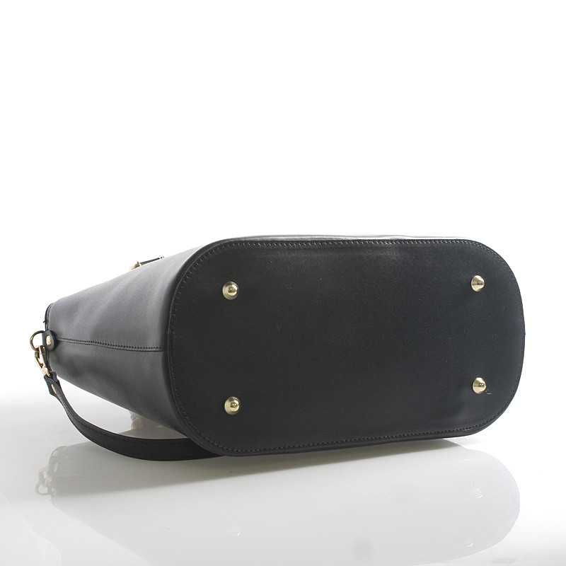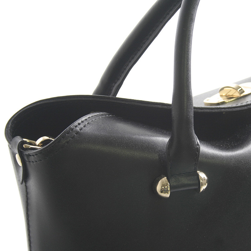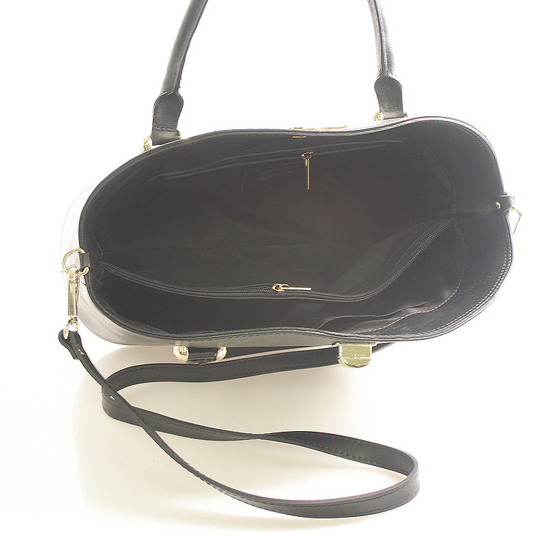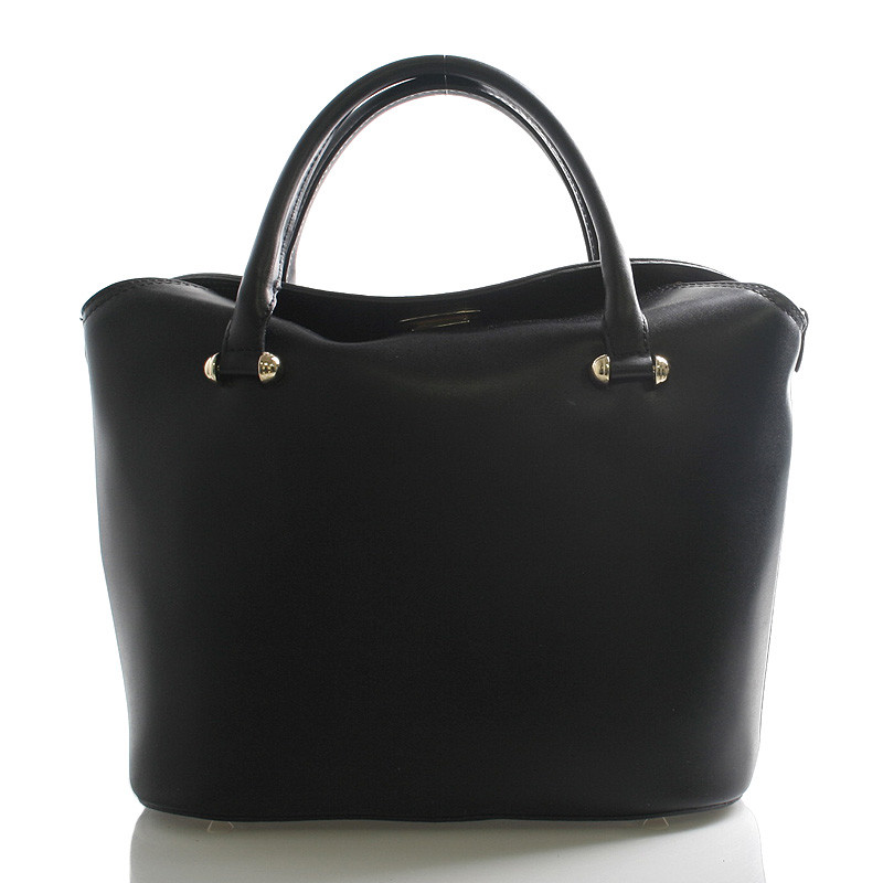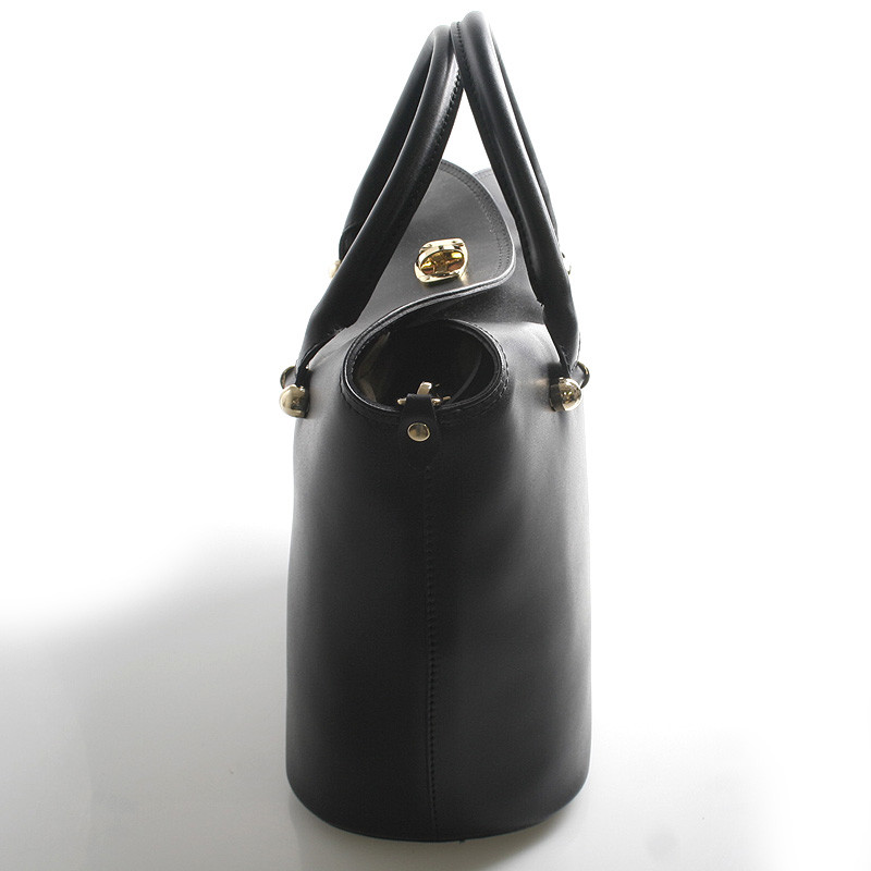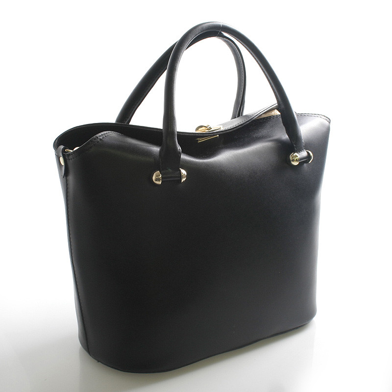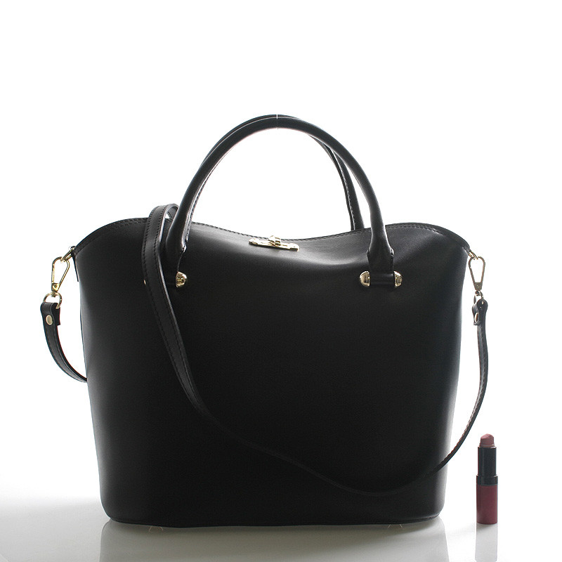 Čierna luxusná kožená kabelka ItalY. Jedinečná elegantná kabelka, s ktorou určite vystúpite z davu. Zapína sa cvokom na otočenie. Vnútri je postranné vrecko na zips a menšie vrecko bez zipsu na mobil, celé veľké vrecko je rozdelené ďalším uzatvárateľným vreckom. Súčasťou je odnímateľný nastaviteľný popruh. Kabelku možno nosiť v ruke, na predlaktí alebo s popruhom cez rameno. Kovanie je v zlatom prevedení.