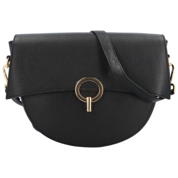 Trendy čierna dámska kožená crossbody kabelka, od značky Delami je neobvyklého tvaru, ktorý určite zaujme na prvý pohľad. Čierny popruh so zlatým kovaním umožňuje nosiť kabelku cez plece alebo do kríža. Hodí sa na každodenné nosenie, ale pokojne aj do divadla. Hlavný úložný priestor zabezpečíte veľkou chlopňou so zlatým ozdobným zapínaním. Zo zadnej strany kabelky zvonku môžete využiť menšiu priehradku. K dispozícii je aj silnejší odnímateľný popruh z príjemnej textílie. Objednajte ešte dnes a vyskúšajte! Vrátiť ju môžete do 30 dní!