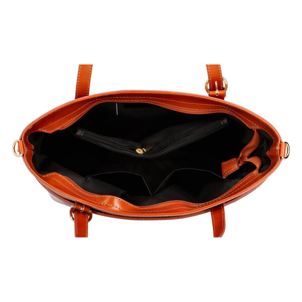Luxusná kabelka z hovädzej usne. Elegantný dámsky doplnok od značky ItalY, ktorý je možné nosiť cez plece. Hodiť sa Vám bude najmä v meste alebo pri pracovných schôdzkach či pri cestách autom. Krásny módny kúsok, ktorému neodoláte! Novinka! Objednajte ešte dnes a vyskúšajte! Vrátiť ju môžete až za 30 dní! Priestranná stredne veľká kabelka je pevná, má koňakovú farbu a pevné dno s cvokmi, ktoré jej zaistia stabilitu aj istú ochranu. Hlavné vrecko sa zapína zipsom. Vnútri nájdete štyri praktické kapsičky na drobnosti. Ďalšie vrecko je na prednej strane kabelky.