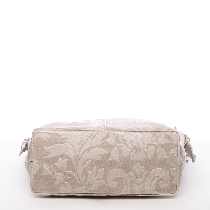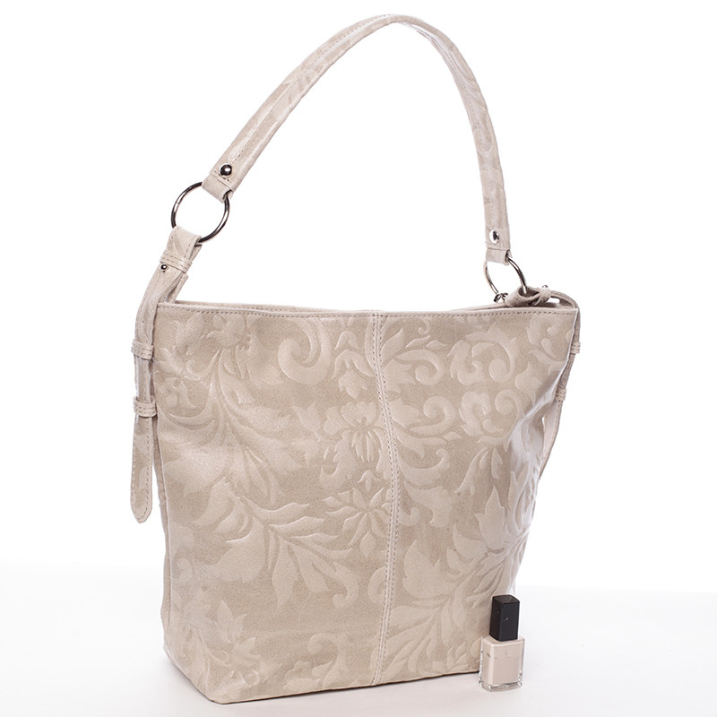 Béžová luxusná stredná mäkká kožená kabelka ItalY . Elegantný kúsok k ležérnemu dámskemu outfitu s efektnými vyrazenými vzormi po celom priestore. Vnútri je otvorený priestor a postranné kapsičky. Kabelku vynosíte ako do práce tak aj na vychádzky. A hlavne, je kožená! Novinka. Objednajte ešte dnes a vyskúšajte, vrátiť ju môžete až do 30 dní!