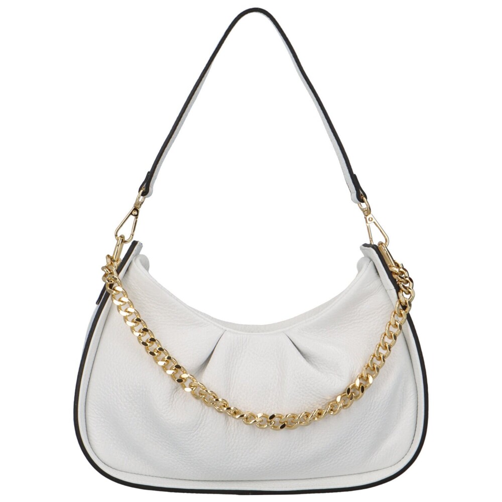 Krásny kožený kúsok v bielej farbe, ktorý bezpečne uschová všetky vaše osobné veci, ktoré chcete mať neustále pri sebe. Delami. Hlavné vrecko je na zips, vo vnútri sú menšie bočné vrecká. Kabelka má nariasený dizajn a zlaté doplnky v podobe krátkej reťaze aj dlhého popruhu, ktorý sa dá pripnúť. Kabelku tak môžete nosiť kabelku cez rameno či do kríža. Objednajte ešte dnes a vyskúšajte! Vrátiť ju môžete až do 30 dní!