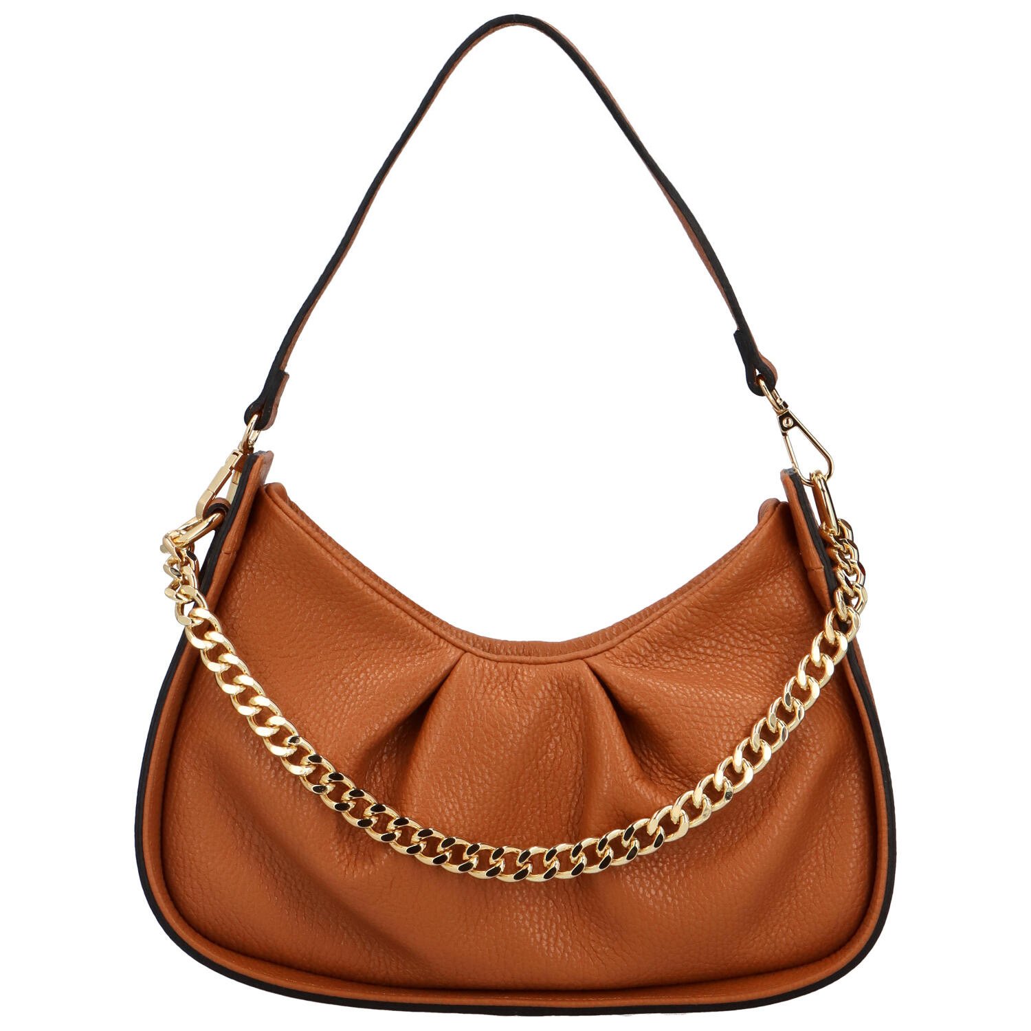 Krásny kožený kúsok v camel farbe, ktorý bezpečne uschová všetky vaše osobné veci, ktoré chcete mať neustále pri sebe. Delami. Hlavné vrecko je na zips, vo vnútri sú menšie bočné vrecká. Kabelka má nariasený dizajn a zlaté doplnky v podobe krátkej reťaze aj dlhého popruhu, ktorý sa dá pripnúť. Kabelku tak môžete nosiť kabelku cez rameno či do kríža. Objednajte ešte dnes a vyskúšajte! Vrátiť ju môžete až do 30 dní!