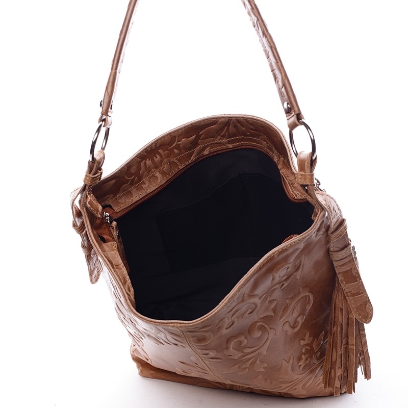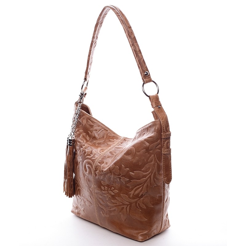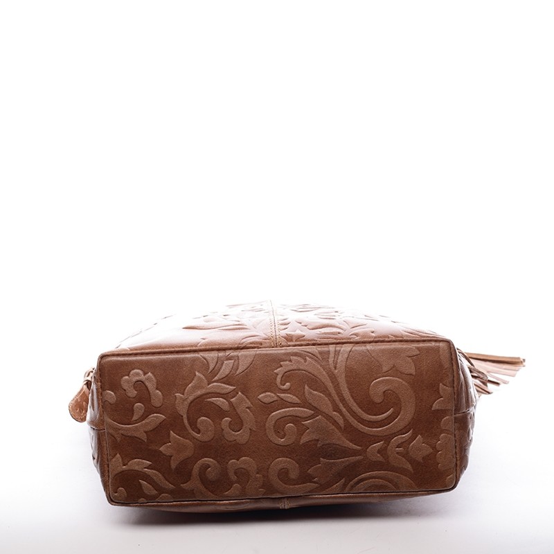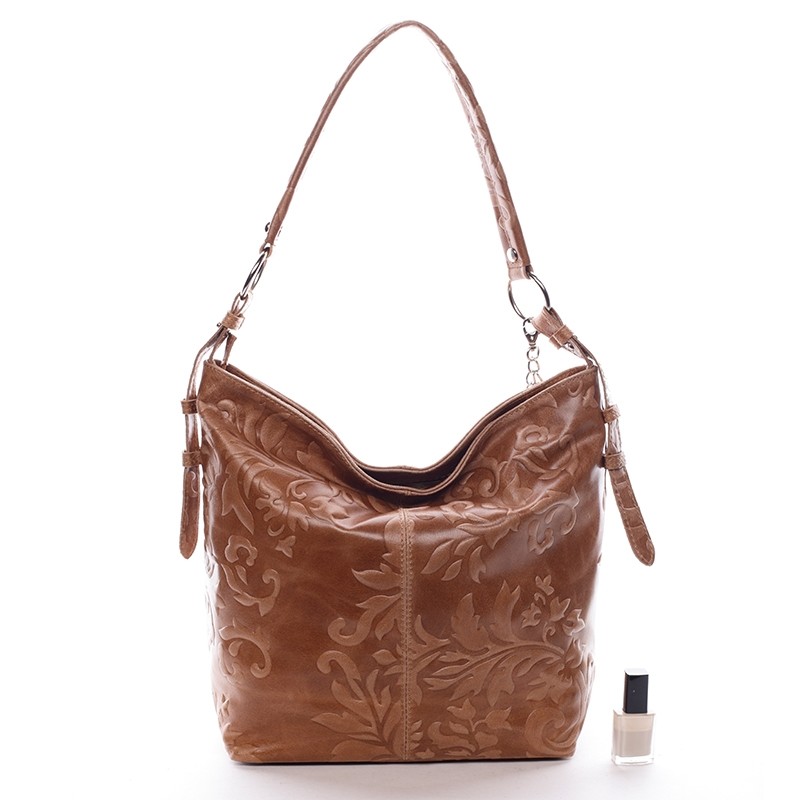 Hnedá luxusná stredná mäkká kožená kabelka ItalY . Elegantný kúsok k ležérnemu dámskemu outfitu s efektnými vyrazenými vzormi po celom priestore. Vnútri je otvorený priestor a postranné kapsičky. Kabelku vynosíte ako do práce tak aj na vychádzky. A hlavne, je kožená! Novinka. Objednajte ešte dnes a vyskúšajte, vrátiť ju môžete až do 30 dní!