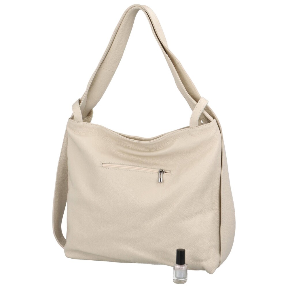 Už poznáte kožené produkty značky ItalY ? Skvelý kvalitný tovar, ktorý máte teraz na dosah ruky. Objednajte ešte dnes a vyskúšajte, vrátiť ju môžete až za 30 dní! Stredne veľká elegantná kabelka cez rameno je jednou z módnych krások, ktoré Vám môžeme ponúknuť. Má svetlo béžovú farbu, je mäkká a jej vzor je vráskavý. Uši kabelky sú spojené s kabelkou, akoby do popruhov, nosiť ju môžete aj ako batoh. Hlavný priestor kabelky sa otvára zipsom. Telefón a drobnosti si uložíte do dvoch voľných vrecúšok alebo vrecúška so zipsom. Aj na zadnej strane kabelky je vrecko so zipsom.