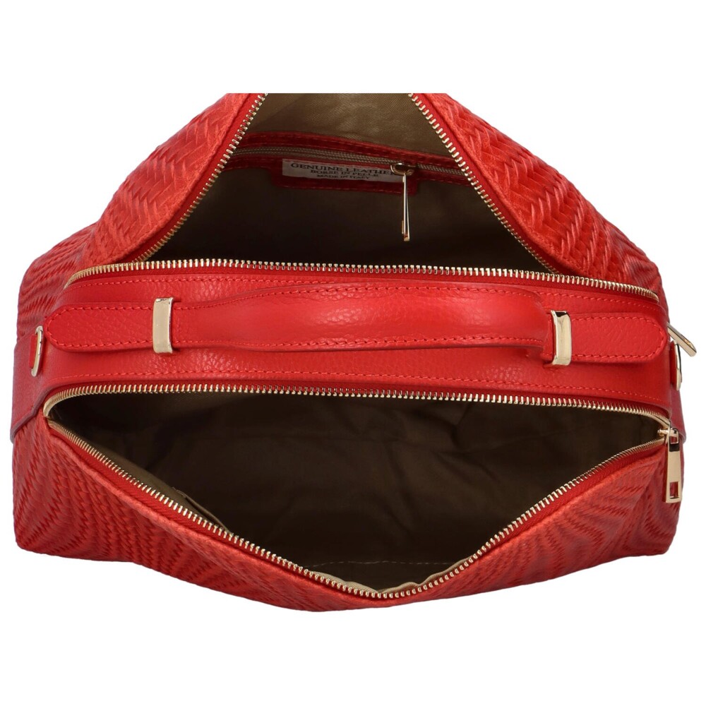 Dámska kožená kabelka z vzorovanej, červenej, talianskej kože od značky Delami. Kabelku je možné nosiť v ruke vďaka krátkemu ušku a aj cez plece, vďaka odnímateľnému popruhu. Hlavné dva úložné priestory uzavriete zipsom. Kabelka krásne drží svoj tvar a má zlaté kovanie. Nechýba malá priehradka na zips na zadnej strane. Neváhajte a objednajte ešte dnes! Vrátiť ju môžete do 30 dní.