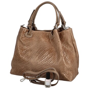 Túto luxusnú, dámsku, koženú kabelku od značky Delami si rozhodne obľúbite. Objednajte ešte dnes a vyskúšajte, vrátiť ju môžete až za 30 dní! Väčšia hnedá až taupe kráska je perfektným modelom do spoločnosti aj do mesta. Nosiť ju môžete na predlaktí, cez rameno a to aj s popruhom. Vzor na koži kabelky je veľmi originálny a očarí nielen Vás, ale aj Vaše okolie. Mäkká kabelka s pevnejším dnom sa otvára zipsom, vo vnútri je priestor rozdelený prepážkou vo forme vrecka na zips. Nechýbajú tu klasické vrecká na telefón a make-up.