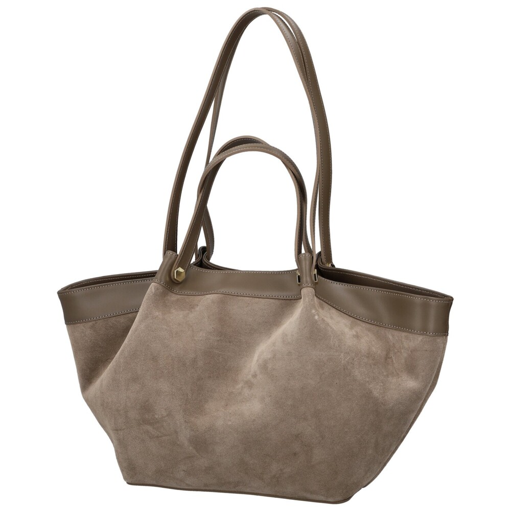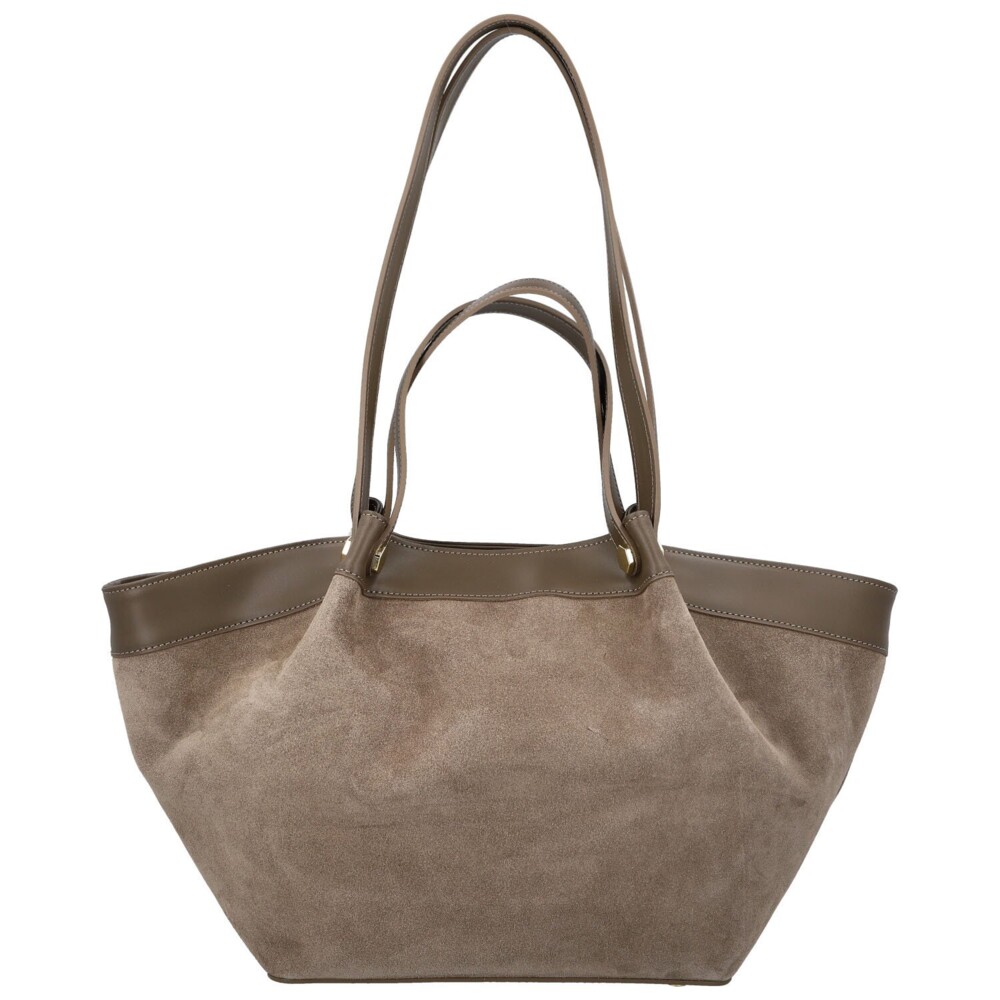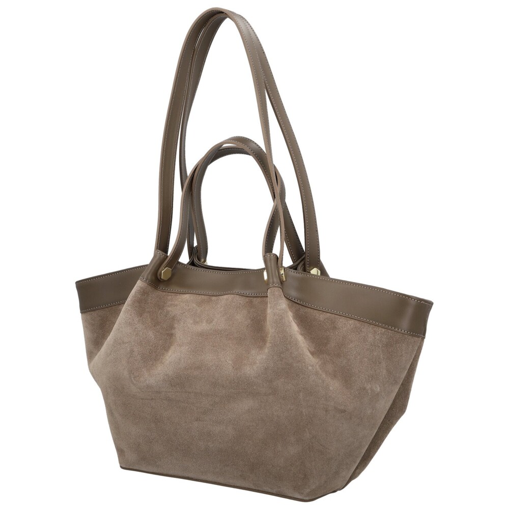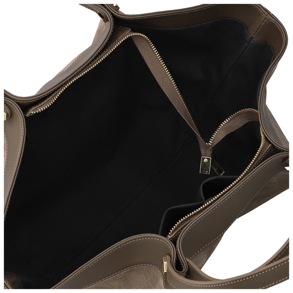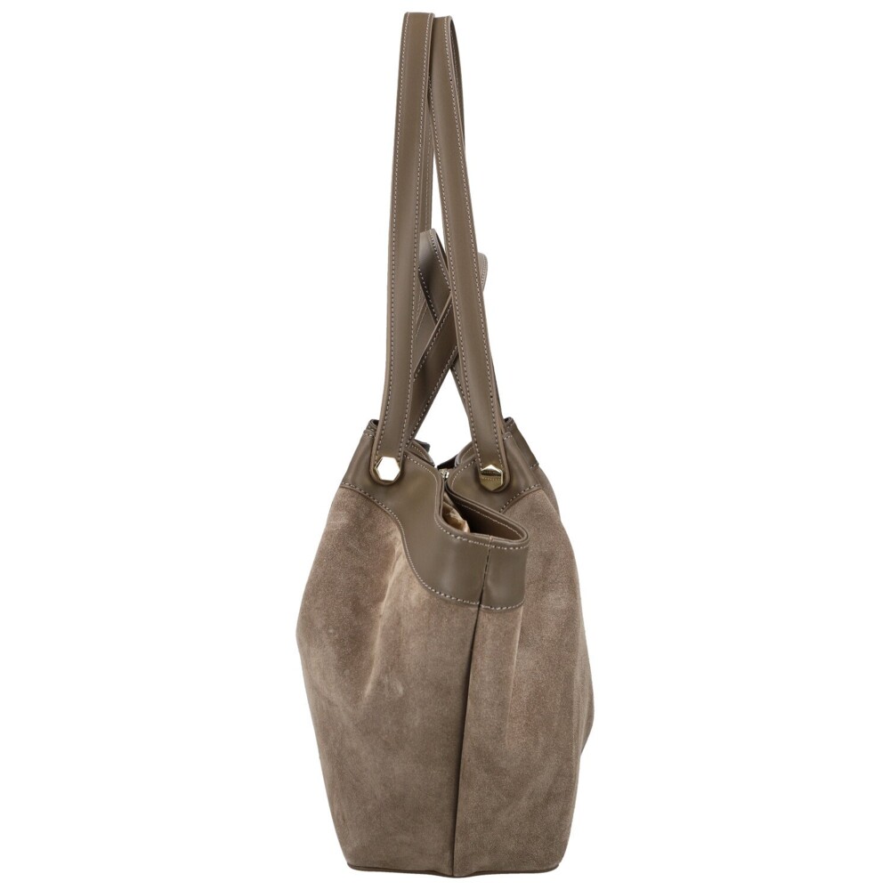 Štýlová dámska kabelka z pravej kože, ktorá zaujme na prvý pohľad svojim kombinovaným prevedením, mäkký brúsený povrch prechádza do hladkého koženého lemu. Čisté línie a precízne spracovanie podčiarkujú jej elegantný charakter. Kabelka má dvojitý typ uší, kratšie pre nosenie v ruke a dlhšie, ktoré sa pohodlne nosia cez rameno. Hlavné vrecko je uzatvárateľné zipsom a skrýva podšívku s praktickými vreckami na drobnosti. Drobné zlaté detaily dodávajú celkovému designu nádych luxusu. Dokonale doplní ako ležérny outfit, tak aj elegantný pracovný štýl. Objednajte ešte dnes a vyskúšajte, vrátiť ju môžete do 30 dní!