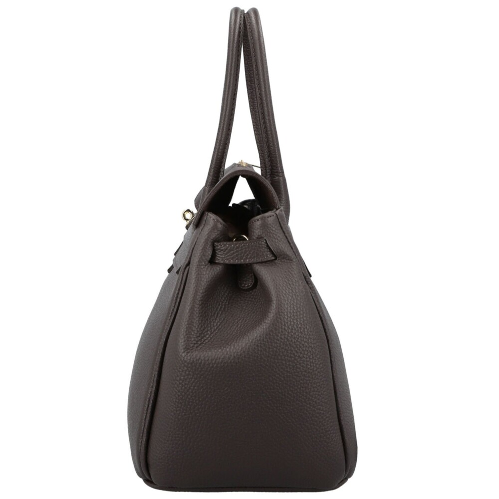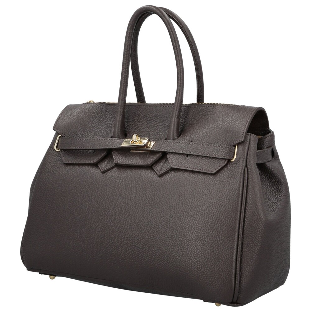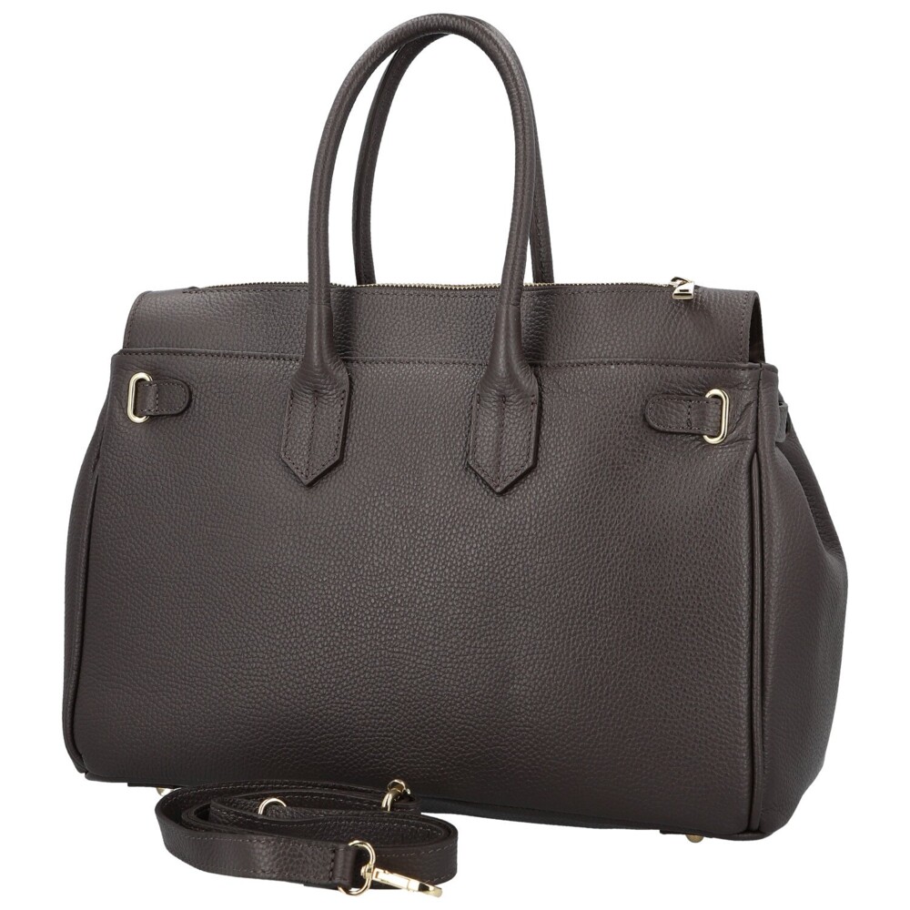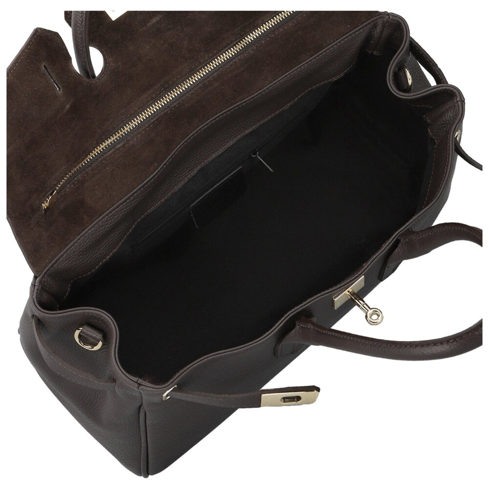 Elegantná dámska kožená kabelka, ktorá zaujme svojim premysleným designom aj nadčasovým šarmom. Vyrobená z kvalitnej, jemne zranenej kože si drží svoj tvar a pôsobí dokonale upravene v každej situácii. Prednú stranu zdobí klopa s ozdobným zlatým kaštieľom, ktorý kabelke dodáva noblesný vzhľad. Pod chlopňou sa ukrýva priestranný interiér s kapsičkami v podšívke pre prehľadné uloženie drobností. Kabelka má navyše praktický zips vo vrchnej časti, vďaka nemu sa do nej ľahko dostane aj bez nutnosti otvárať klopu. Pevné uši perfektne padnú do ruky a odnímateľný, nastaviteľný popruh umožňuje pohodlné nosenie cez rameno. Spodná časť chráni kovové nožičky proti poškriabaniu. Jemné zlaté detaily podčiarkujú celkový luxusný dojem a robia z tejto kabelky elegantného spoločníka pre každý deň. Objednajte ešte dnes a vyskúšajte, vrátiť ju môžete až za 30 dní!