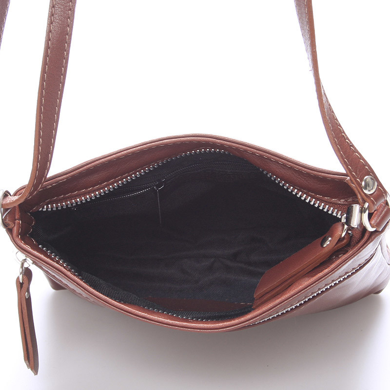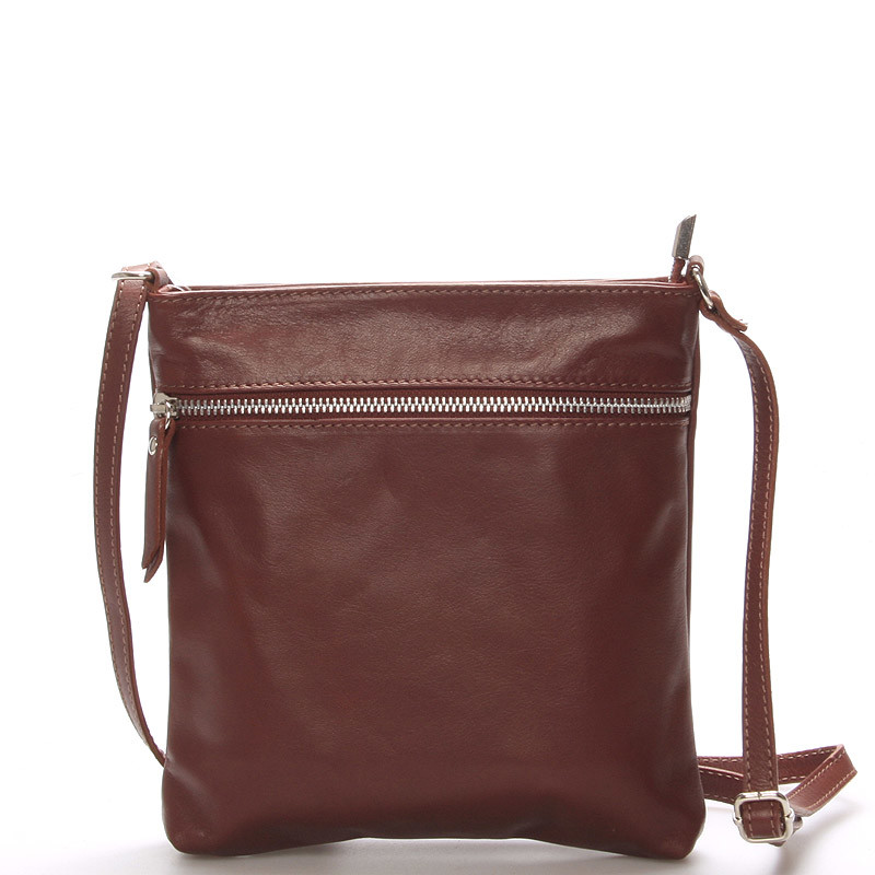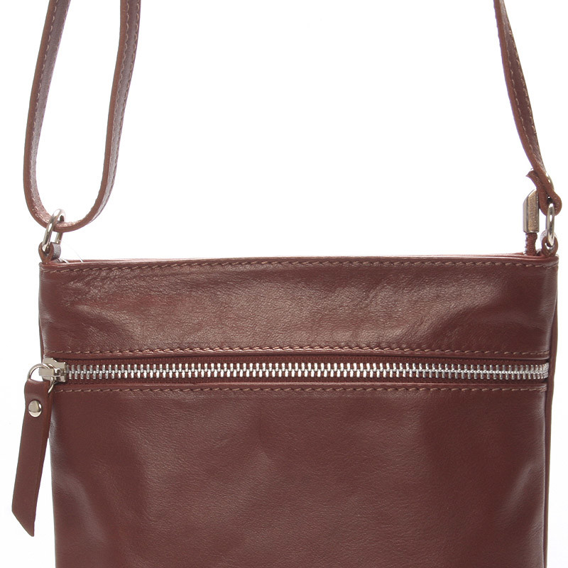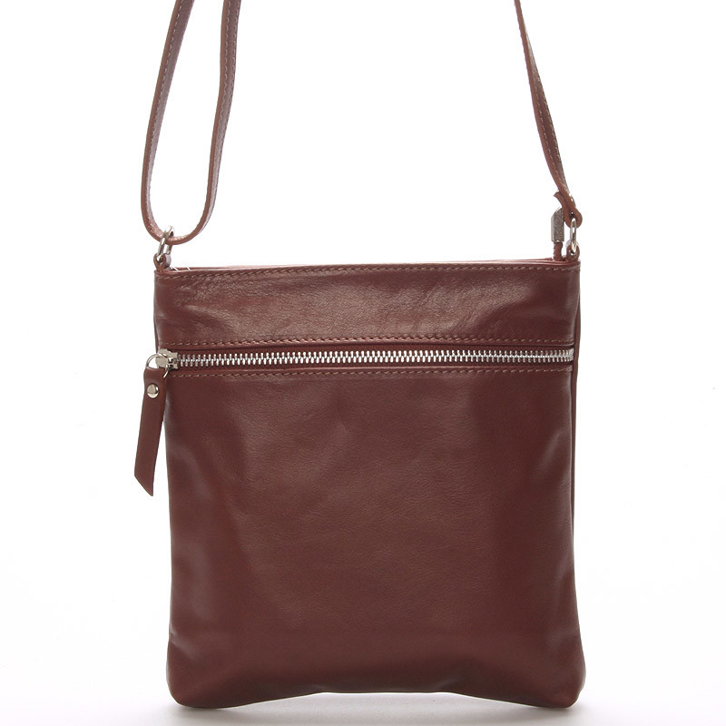 Módna dámska menšia tmavo hnedá kožená taška cez rameno Italy. Mäkká kabelka cez rameno alebo ako crossbody pre každodenné nosenie na všetky potrebné drobnosti každej ženy, Vám bude originálnym módnym spoločníkom. Zatvára sa na zips. Na prednej a zadnej strane je vrecko na zips. Vo vnútri má kabelka menšie vrecká na drobnosti. Má nastaviteľný remienok. Poďte s dobou a buďte in. Novinka 2017!