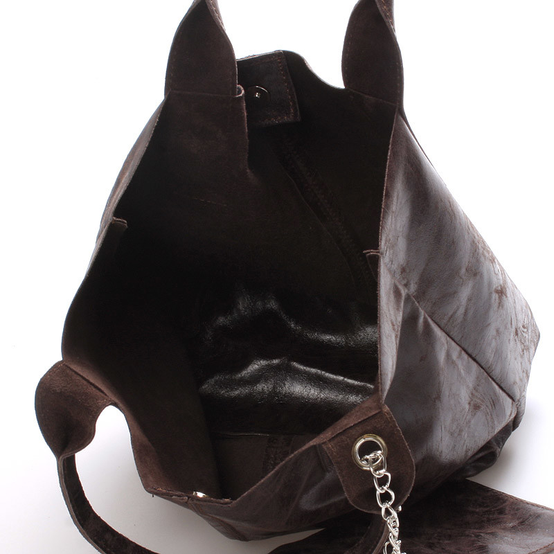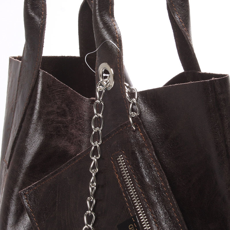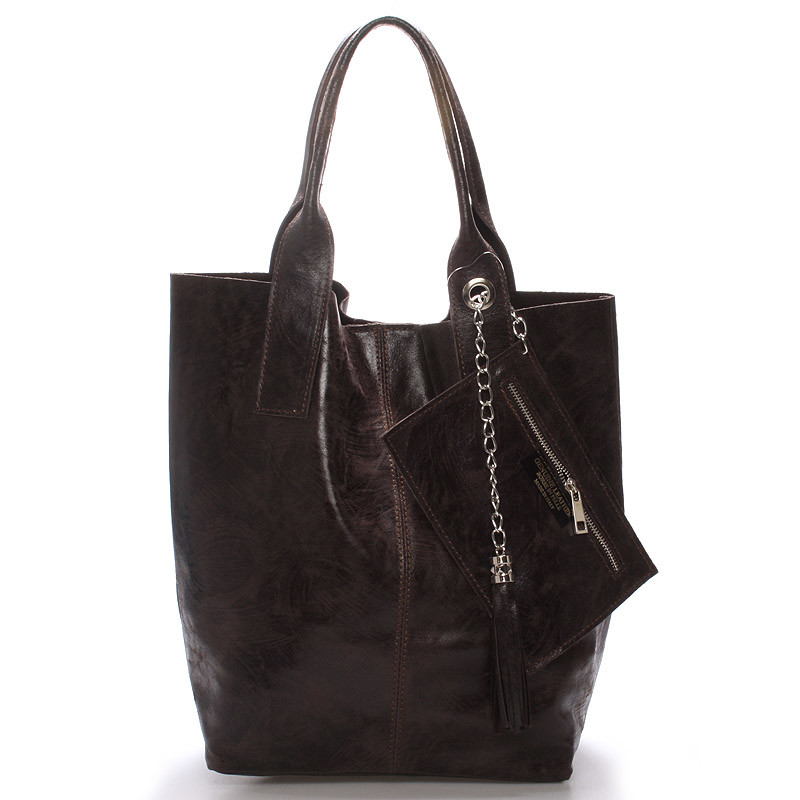 Hnedá veľká kožená kabelka ItalY štýl shopper. Priestranná nekonvenčná kabelka cez rameno alebo do ruky, do ktorej dáte všetko. Jednoduchý taliansky dizajn v kombinácii s kožou (bez podšívky) robí z kabelky kvalitného každodenného pomocníka. Zapína sa na magnetický cvoček, vnútri je otvorená bez vreciek. Ku kabelke je menšie puzdro na kovovej retiazke, slúžiacej ako vrecko na mobil či peňaženku. Novinka. Objednajte ešte dnes a vyskúšajte, vrátiť ju môžete až za 30 dní!