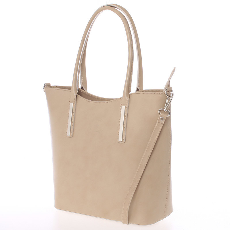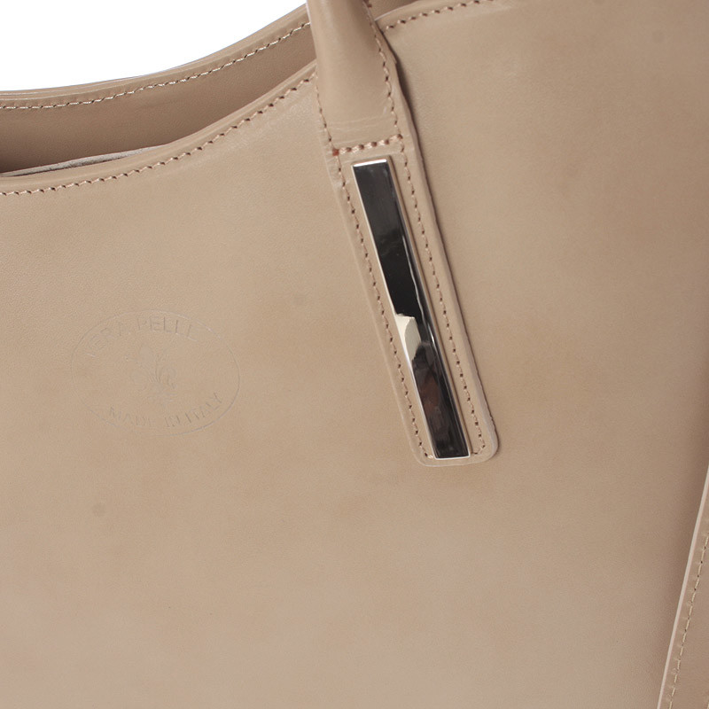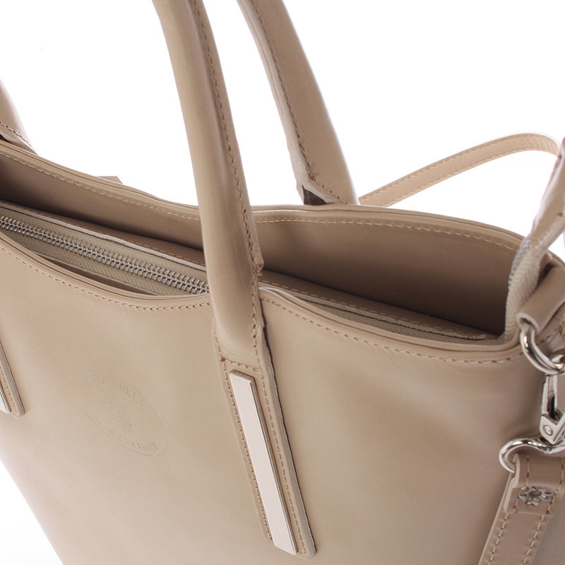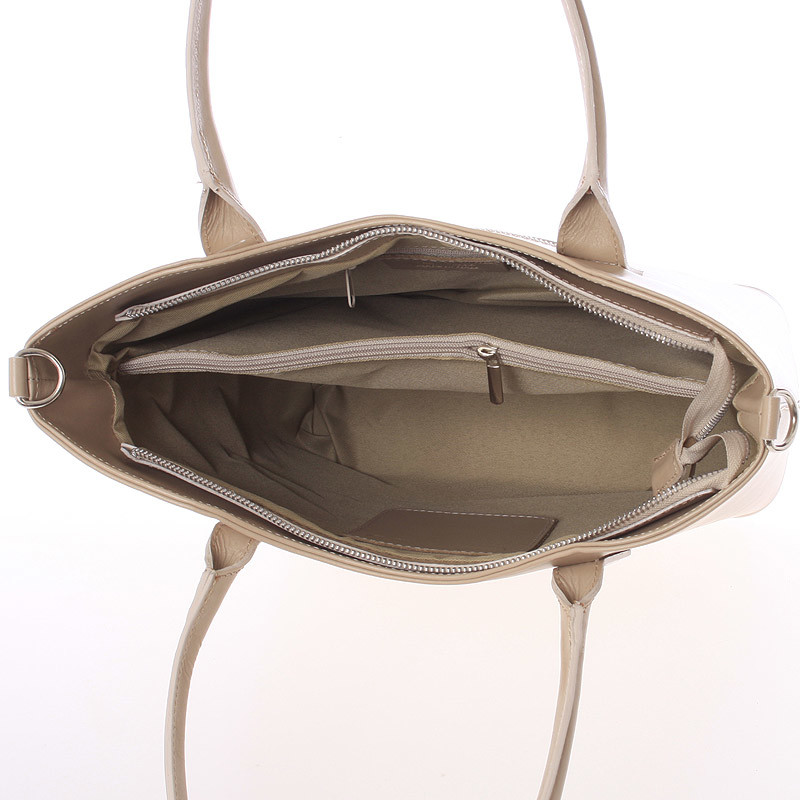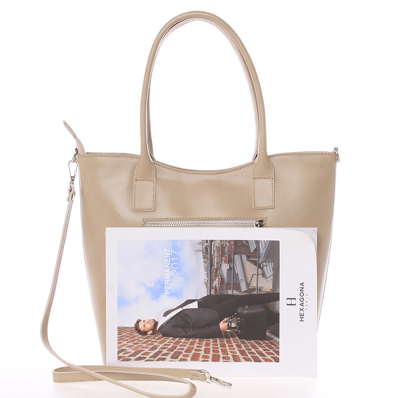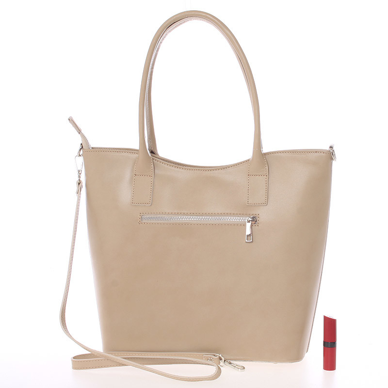Jednoduchý dizajn tejto tmavej béžovej kabelky potvrdzuje eleganciu výrobkov značky Italy. Táto veľká pevná kožená kabelka Vás môže sprevádzať každý deň. Hodí sa ako do spoločnosti, tak aj ako pravá ruka do práce a do mesta. Má ideálne dlhšie uši, ale aj odnímateľný popruh. Zatváranie je vyriešené zipsom. Vnútri sú dve veľké hlavné vrecká delené prepážkou so zipsom, použiteľné ako tretie vrecko. Na zadnej stene nájdete ako zvnútra, tak i zvonku kapsu so zipsom. Nechýba tu menšia voľná kapsička na menší telefón. Objednajte ešte dnes a vyskúšajte, vrátiť ju môžete až za 30 dní!