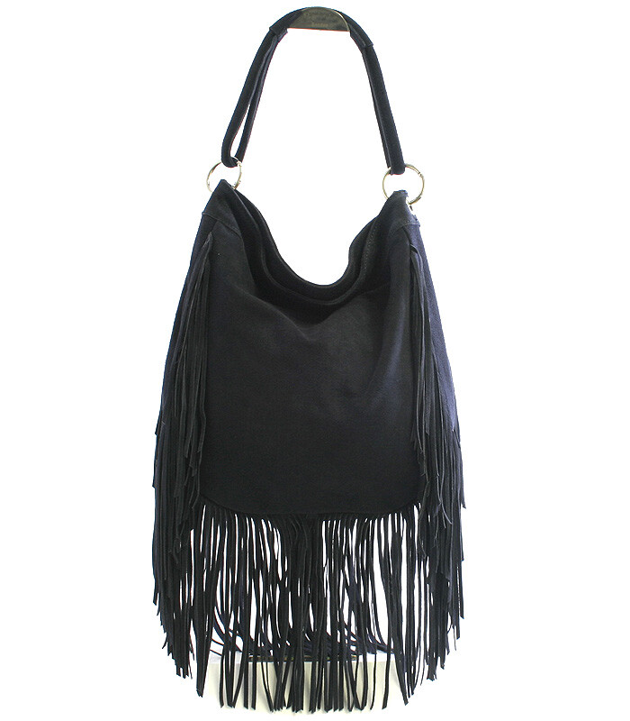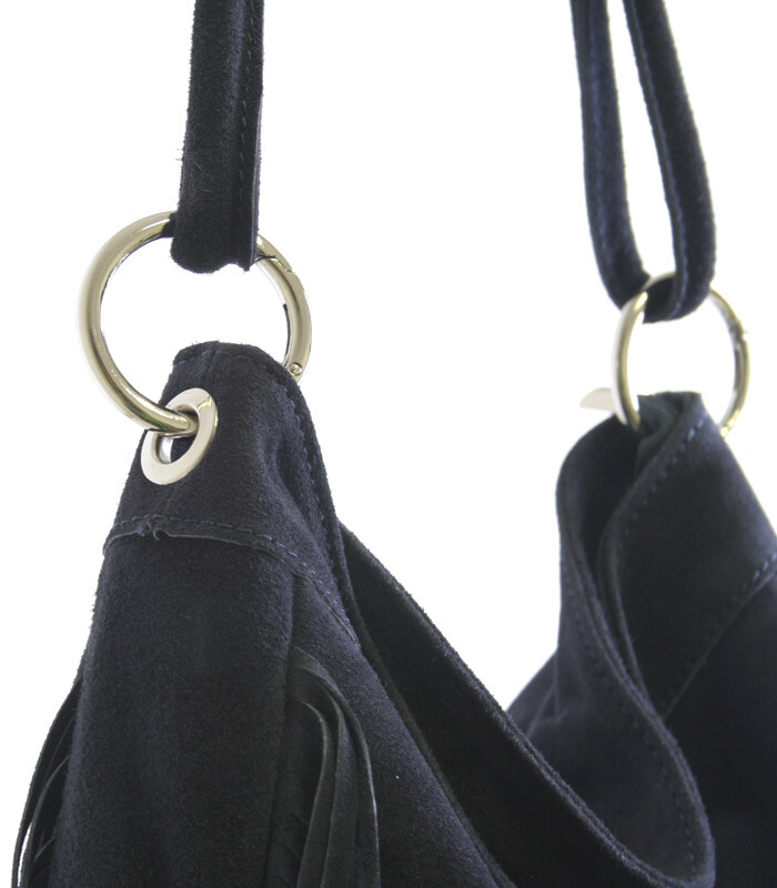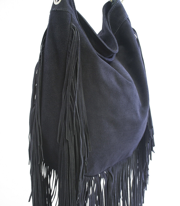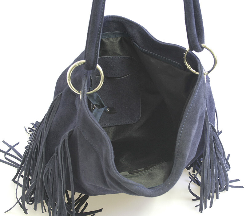 Celo-kožená brúsená modrá kabelka ItalY so strapcami. Zapína sa zipsom. Vnútri je nedelený priestor, ďalej jedno vrecko na mobil a druhá naproti na zips. Kabelku možno nosiť na pleci alebo v ruke.