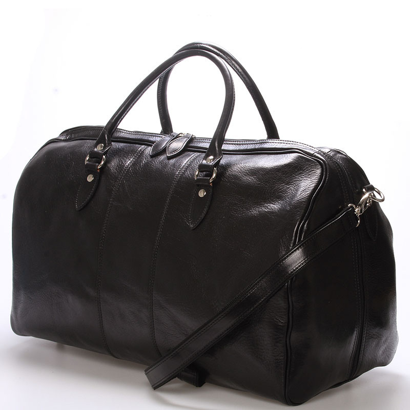 Novinka. Objednajte ešte dnes a vyskúšajte, vrátiť ju môžete až do 30 dní! Čierna kožená veľká cestovná taška ItalY . Elegantný a originálny kúsok pre pohodlné cestovanie. Taška je robustná a veľmi priestranná s popruhom cez rameno. Je ušitá z hovädzej kože, takže Vám bude poctivo a dlho slúžiť.