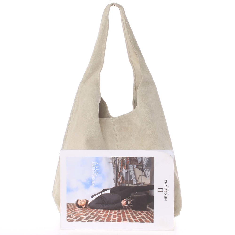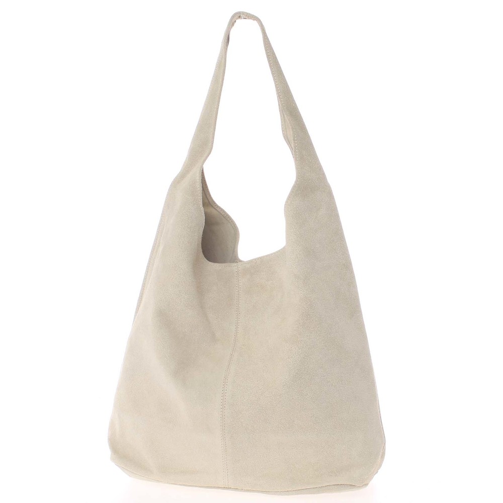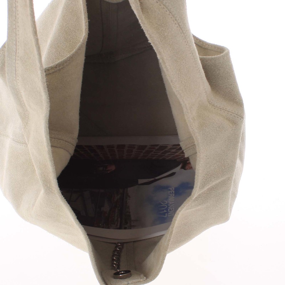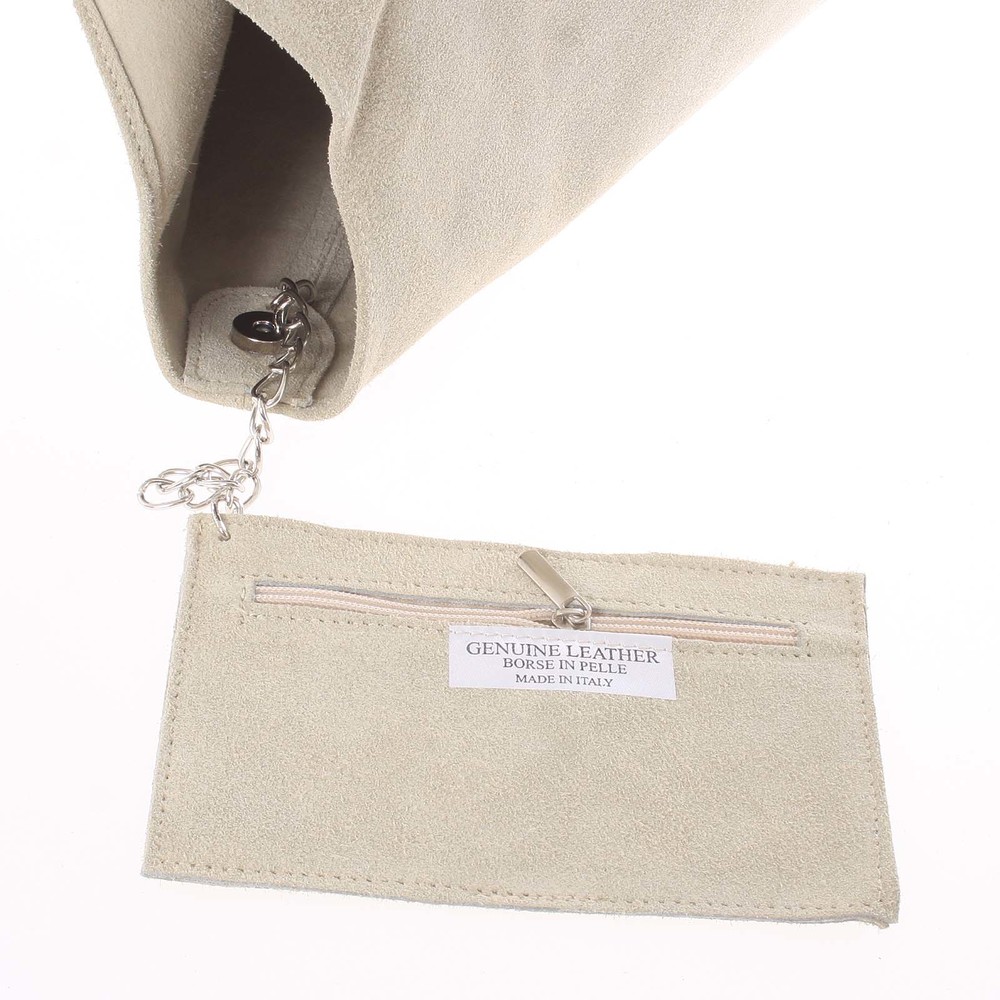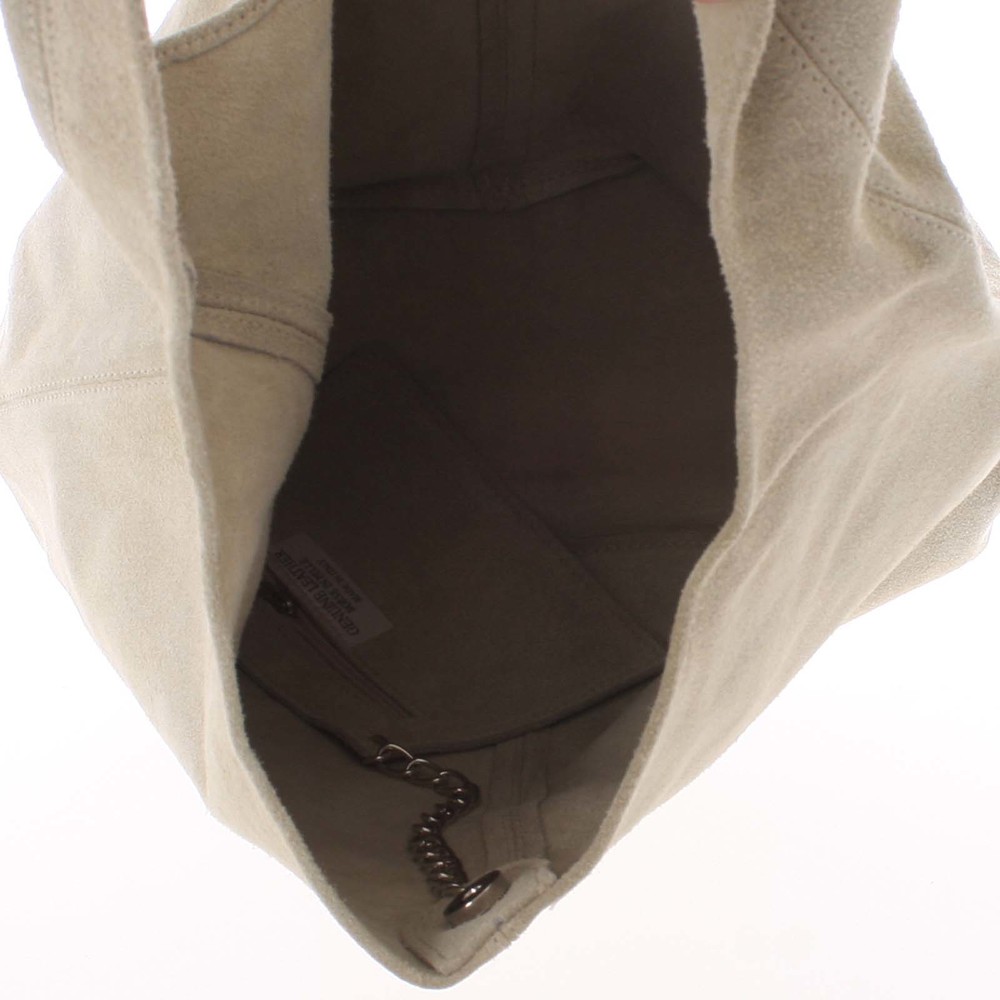 Svetlo béžová luxusná veľká mäkká kožená semišová kabelka ItalY. Elegantný klasický kúsok k ležérnemu dámskemu outfitu. Z oboch strán kabelky je rovnaká. Ucho kabelky je pevne prišité. Vnútri nájdete len priestor pre denné potreby a osobné veci. Zapína sa magnetickým cvočkom na menšom koženom jazyku, ku ktorému je pripojený kovový retiazka s vreckom so zipsom, na cennosti či kozmetiku. Novinka. Objednajte ešte dnes a vyskúšajte, vrátiť ju môžete až za 30 dní! Luxus môže byť aj jednoduchý!