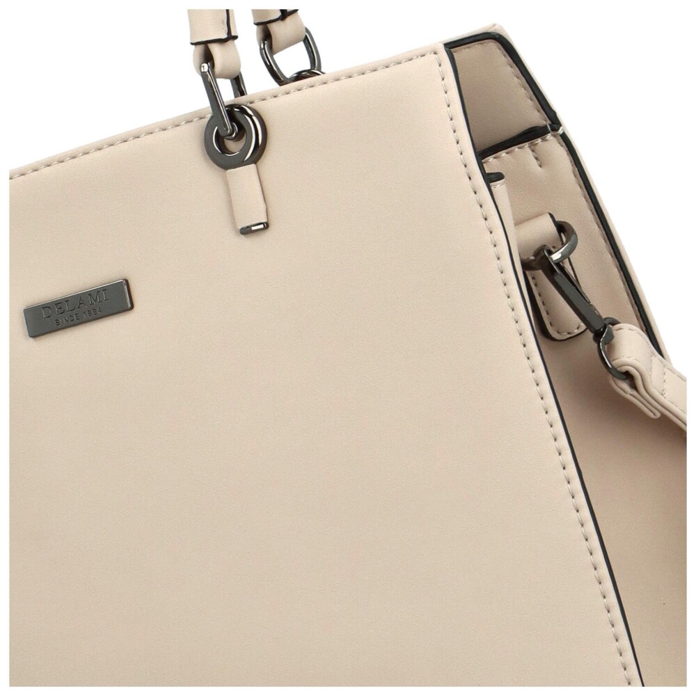 Elegantná krémová kabelka, pre moderné ženy od českých dizajnérov, ktorá doplní váš outfit. Je vyrobená s láskou z vysoko kvalitnej ekologickej kože. Hladký povrch, odľahčený materiál, jemné prešitie a logo značky Delami v striebornej farbe doplnia celkový jemný vzhľad kabelky. Hlavné vrecko po otvorení zipsu ponúka priestor delený stredovým zipsovým vreckom a pre drobnosti tu nechýbajú bočné menšie kapsičky v podšívke. Zadný diel disponuje malým vreckom na zips. Pevné uši vám padnú ako do ruky, tak aj cez rameno. Na nosenie cez plece či do kríža poslúži dlhý, nastaviteľný popruh na pripnutie. V spodnej časti sú kovové nožičky, ktoré kabelku chránia pred poškriabaním alebo zašpinením. Kabelka, ktorá podčiarkne jedinečnosť každej ženy. Objednajte ešte dnes a vyskúšajte! Vrátiť ju môžete až do 30 dní!