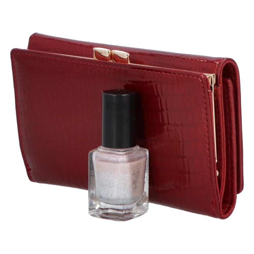 Dámska kožená peňaženka v krásnom prevedení so zlatým kovaním a veľkosťou do každej dámskej kabelky. Drobné mince bezpečne uschováte v bočnom vrecku, kde otváranie je v kovovom rámčeku. Po roztvorení klopy na cvok, peňaženka ponúkne dostatok priehradiek na uloženie ako papierových peňazí, tak dokladov a kariet. Predný diel zdobí logo značky. Tovar sa dodáva v darčekovej krabičke. Tak objednajte ešte dnes a vyskúšajte, vrátiť ju môžete do 30 dní.