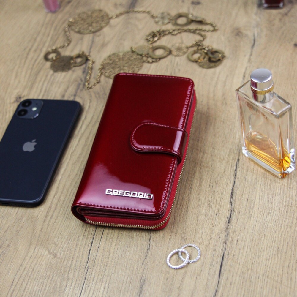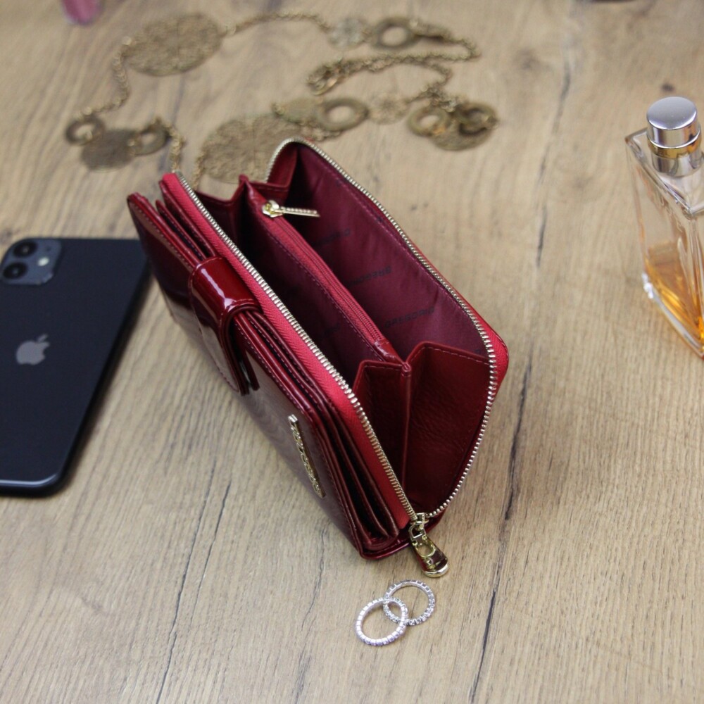 Elegantná kožená peňaženka v lesklej, lakovanej úprave pôsobí luxusne a sofistikovane. Je navrhnutá na výšku a jej prednú časť zdobí decentné logo značky a zapínanie na štýlovú zápinku. Po otvorení sa ponúka prehľadne usporiadaný priestor pre platobné karty a priehradky na papierové bankovky. Zadnú časť dopĺňa praktické zipsové vrecko určené pre mince. Zlaté kovanie podčiarkuje jej elegantný vzhľad. Dokonalá voľba pre ženy, ktoré majú rady štýl, kvalitu a poriadok. Objednajte ešte dnes a vyskúšajte, vrátiť ju môžete až za 30 dní!