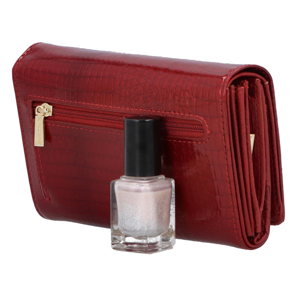 Luxusná dámska kožená peňaženka, ušitá z kože, v lakovanom prevedení, v krásnej kombinácii červenej a čiernej, do každej dámskej kabelky. Tiež ju zdobí zlaté logo značky na prednej strane. Po otvorení klopy na cvok ponúka dostatok miesta na uloženie vašich papierových aj kovových peňazí, dokladov aj kariet. Nechýba aj priehľadná priehradka, napríklad na fotografii vašich najbližších. Na zadnej strane malé zipsové vrecko. Peňaženka má RFID ochranu, proti nechcenému čítaniu platobných kariet. Peňaženka je dodávaná v darčekovej krabičke. Tak objednajte ešte dnes a vyskúšajte, vrátiť ju môžete do 30 dní.