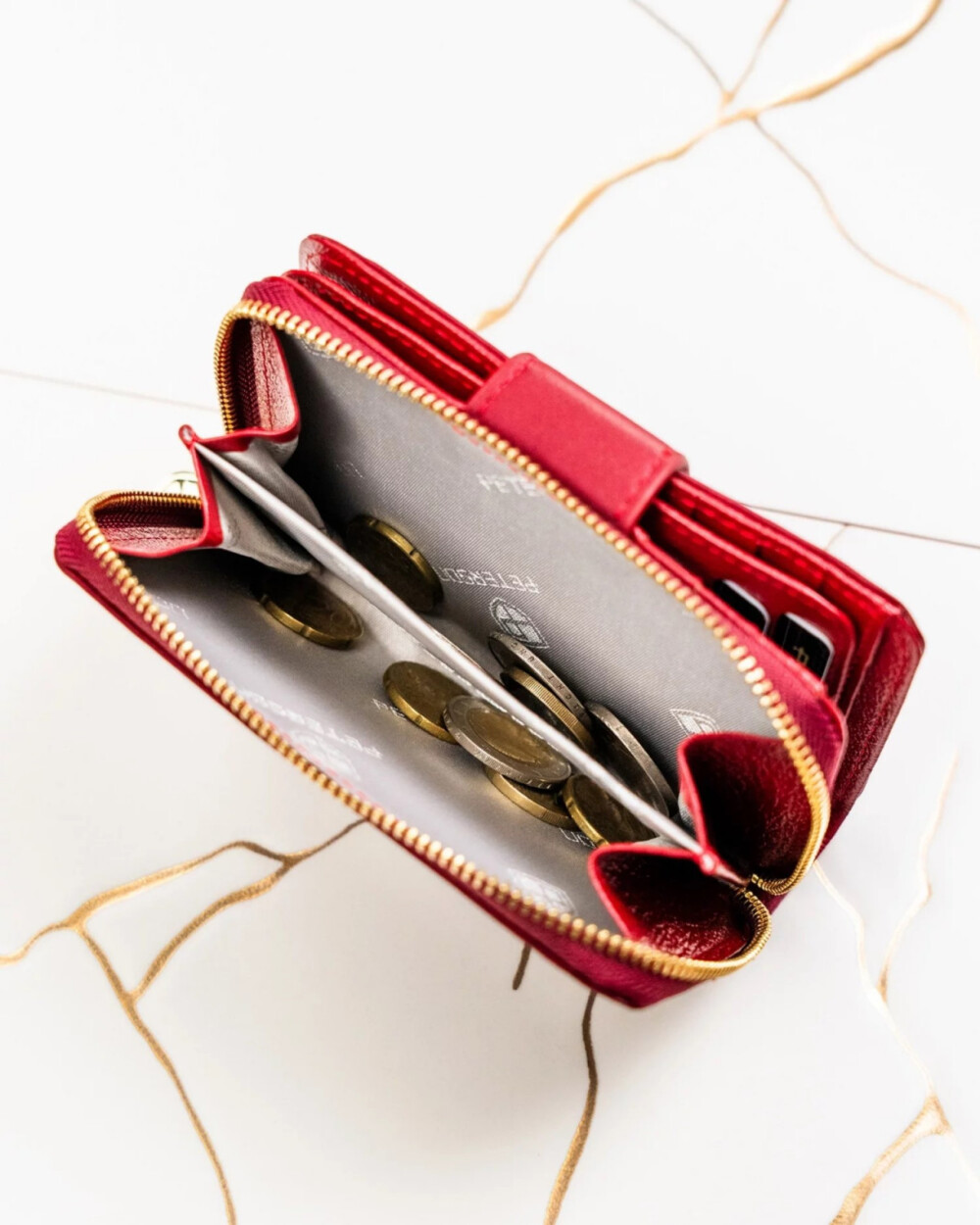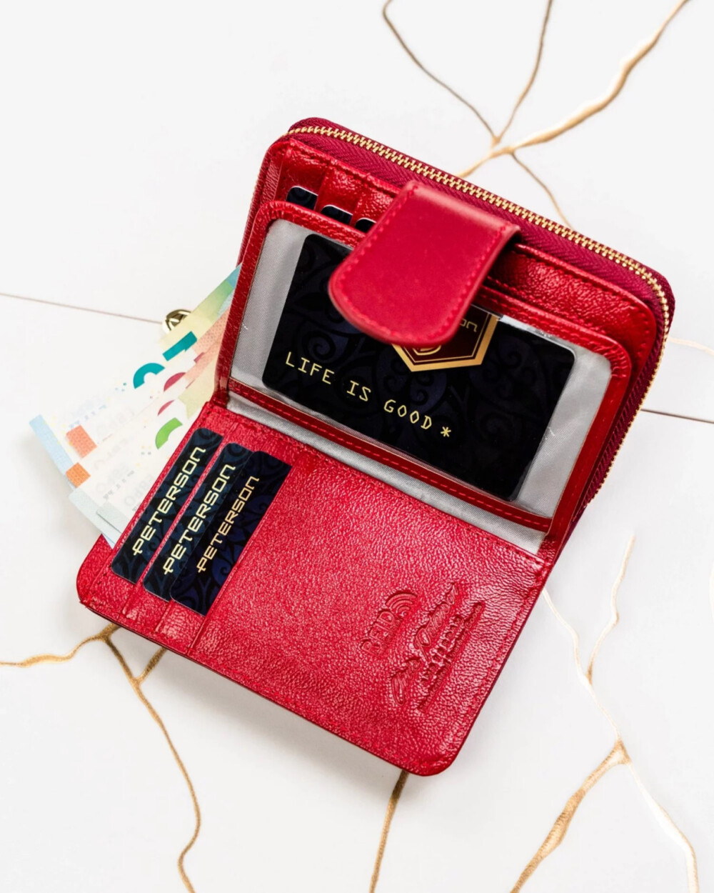 Červená, matná a plná osobnosti, táto dámska kožená peňaženka spája jednoduchý dizajn s premyslenou praktickosťou. Na zapínacej klope jemne žiari okrúhle logo Peterson, vo vnútri sa skrýva priestor pre karty a papierové peniaze s ochranou RFID. Zadné zipsové vrecko bezpečne pojme mince a umožní rýchly prístup k drobným. Celá v matnom červenom odtieni pôsobí moderne a sebavedome, ideálna na každodenné nosenie s gráciou a štýlom. Ojednajte ešte dnes a vyskúšajte, vrátiť ju môžete do 30tich dní.