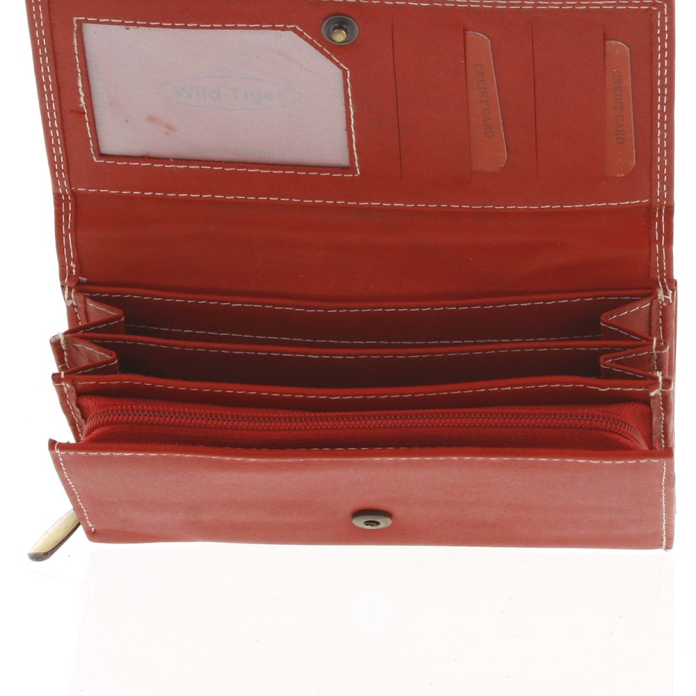 Štýlová, moderné duálne prešívaná dámska jemná kožená červená peňaženka od značky WILD . Ak máte rada jednoduchý dizajn, ľahkú kvalitnú kožu a veľký priestor pre svoje karty a doklady, je táto peňaženka priamo pre Vás! Peňaženka je obojstranná. Z oboch strán sa otvára klasickým cvočky. Na jednej strane nájdete miesto pre peniaze kovové i bankovky a pre karty či vizitky. Na druhej strane je vyhradený priestor pre doklady, karty a vizitky. Podšívka peňaženky je s originálnym vzorom. Logo značky je uprostred prednej strany peňaženky. Ideálny aj ako darček. Objednajte ešte dnes a vyskúšajte, vrátiť ju môžete až za 30 dní!