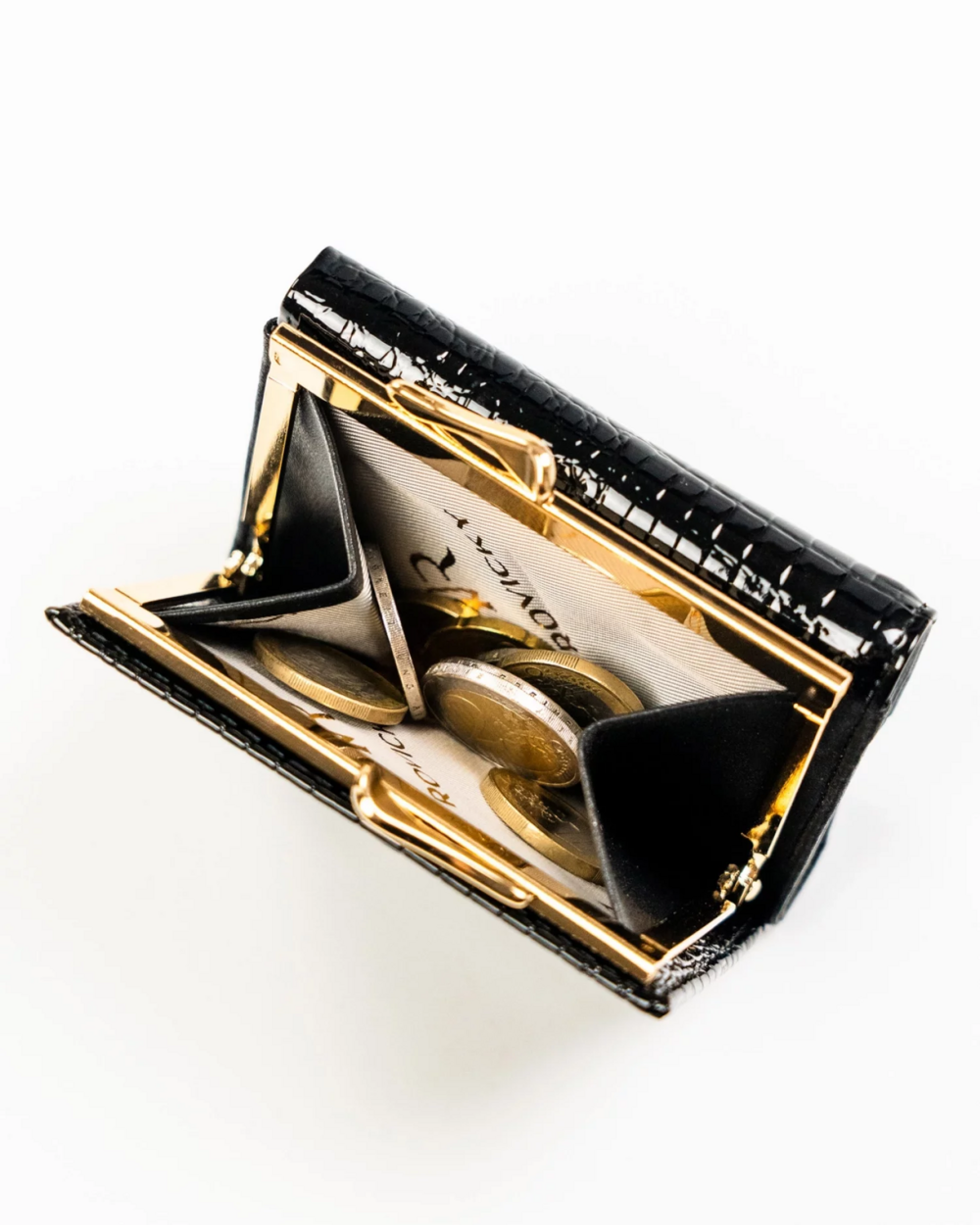 Táto mini kožená peňaženka Rovicky je ideálnou voľbou pre ženy, ktoré hľadajú štýlový doplnok v elegantnom prevedení. Na prvý pohľad zaujme lesklý štruktúrovaný povrch s efektom krokodílej kože a výrazným zlatým logom značky na klope, ktoré dodáva celému kúsku nádych luxusu. Po otvorení klopy nájdete prehľadne rozvrhnutý priestor určený pre platobné karty a zložené papierové bankovky. Praktickým prvkom je zadné vrecko na mince, uzatvárané kovovým rámčekom, ktorý umožňuje rýchle otvorenie aj pohodlné vyberanie drobných. Peňaženka je vybavená RFID ochranou, ktorá zabezpečí vaše karty pred neoprávneným skenovaním. Súčasťou je aj elegantná darčeková krabička. Objednajte ešte dnes a vyskúšajte, vrátiť ju môžete až za 30 dní!