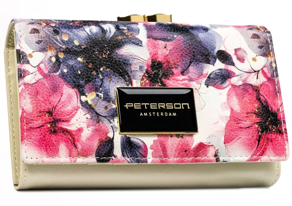 Elegantná dámska peňaženka Peterson s kvetinovým motívom, ktorý zdobí celú prednú stranu. Dominantou je kovové logo značky umiestnené uprostred. Peňaženka sa uzatvára na cvok a vo vnútri ukrýva priehradky na karty aj bankovky. Zadná časť je riešená klasickým mincovníkom v kovovom rámčeku so zlatým kovaním. Peňaženka je vybavená technológiou RFID, ktorá chráni vaše karty pred nežiaducim skenovaním. Dodáva sa v darčekovej krabičke, ideálny aj ako štýlový darček. Ojednajte ešte dnes a vyskúšajte, vrátiť ju môžete do 30tich dní.