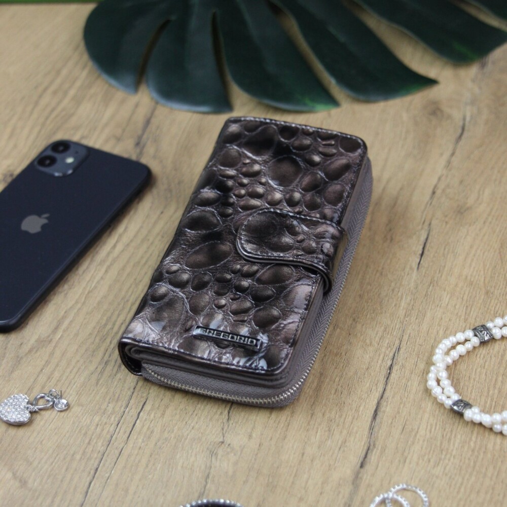 Značka Gregorio prináša ženám módne potešenie, a to v podobe kvalitnej luxusnej peňaženky. Dámska kožená peňaženka, ušitá z kože, v lakovanom materiáli do každej dámskej kabelky. Na prednej strane ju zdobí logo značky. Po otvorení cvoku ponúka dostatok miesta na uloženie vašich papierových peňazí, dokladov aj kariet. V druhej časti je veľké vrecko na mince, ktoré sa zapína zipsom. Peňaženka je dodávaná v darčekovej krabičke. Tak objednajte ešte dnes a vyskúšajte, vrátiť ju môžete do 30 dní.
