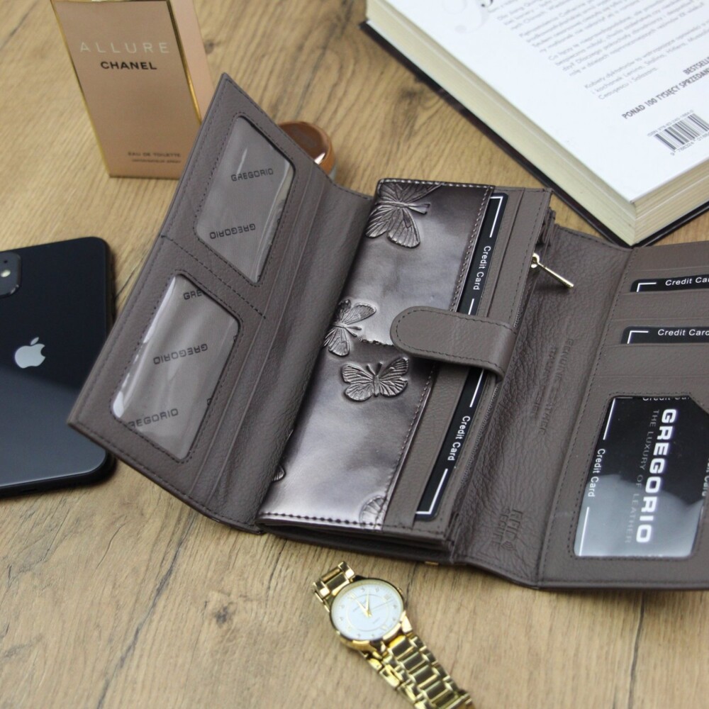 Priestranná veľká dámska kožená peňaženka od značky Gregorio. Peňaženka je v luxusnom lakovanom prevedení s motívom motýľov, otvára sa na cvok a vo vnútri nájdete dostatok miesta na uloženie vašich papierových aj kovových peňazí, dokladov a platobných kariet. Nechýba obľúbené priehľadné okienko na fotografie vašich najbližších. Na prednej strane logo značky. Tovar sa dodáva v darčekovej krabičke. Tak objednajte ešte dnes a vyskúšajte, vrátiť ho môžete do 30 dní.
