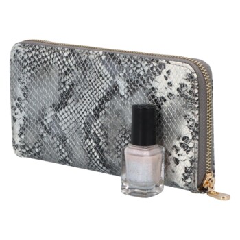 Módna a veľmi obľúbená, praktická dámska kožená peňaženka v puzdrovom prevedení s hadím dizajnom. Po roztvorení zipsu, ponúka dostatok miesta na uloženie vašich dôležitých kariet, dokladov a papierových peňazí. Na drobné mince nechýba vrecko na zips. K peňaženke je aj prídavné, kožené pútko, na nosenie na zápästí. Doplnky sú ladené do zlatej farby. Tovar sa dodáva v darčekovej krabičke. Tak ob jednajte ešte dnes a vyskúšajte, vrátiť ju môžete až za 30 dní!