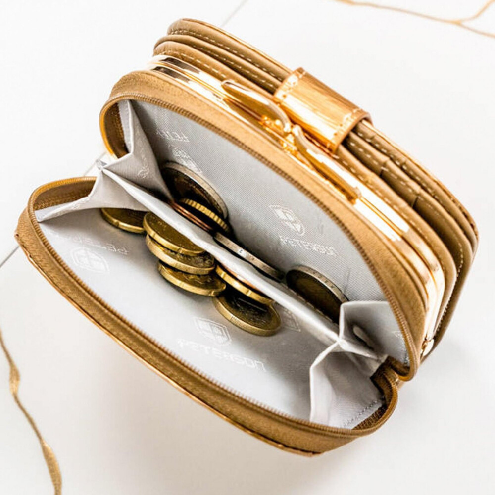 Štýlová dámska peňaženka z pravej kože v žiarivej zlatej farbe je dokonalým doplnkom pre aj slávnostné príležitosti. Na prednej strane ju zdobí elegantné logo značky. Po otvorení zapínania ponúka prehľadné usporiadanie, priehradky na platobné karty a bankovky, uprostred praktický priestor s kovovým rámčekom a vzadu zipsové vrecko na drobné mince. Vďaka integrovanej RFID ochrane budú vaše karty vždy v bezpečí. Ojednajte ešte dnes a vyskúšajte, vrátiť ju môžete do 30tich dní.