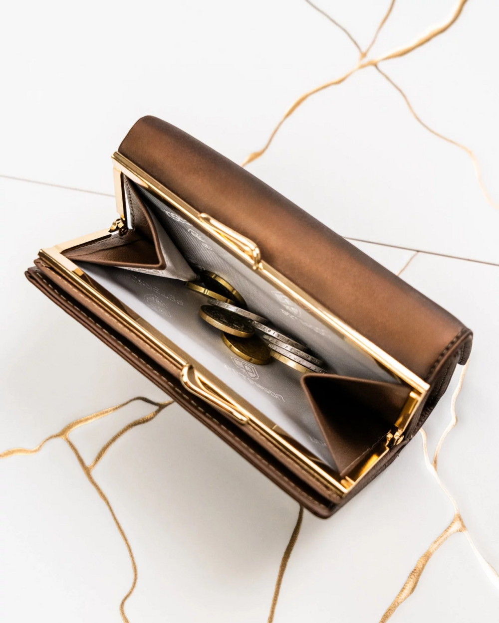 Elegantná menšia peňaženka s koženkovým povrchom a koženým vnútrom. Prednú klopu zdobí kovové logo značky. Vnútri nájdete prehľadné priehradky na karty aj priestor na papierové bankovky. Na zadnej strane je praktické vrecko na mince v kovovom rámčeku. Peňaženka má RFID ochranu a dodáva sa v darčekovej krabičke. Ojednajte ešte dnes a vyskúšajte, vrátiť ju môžete do 30tich dní.