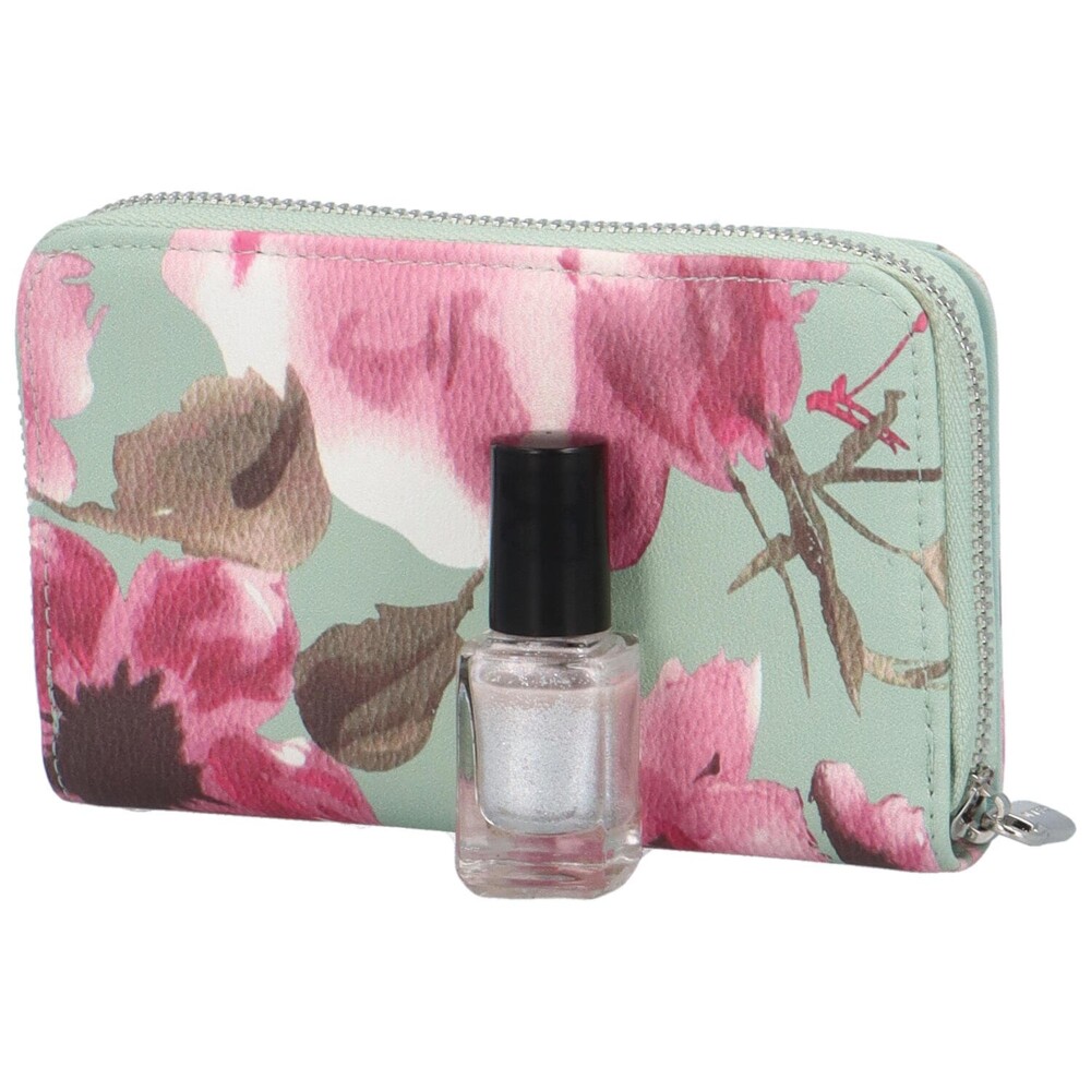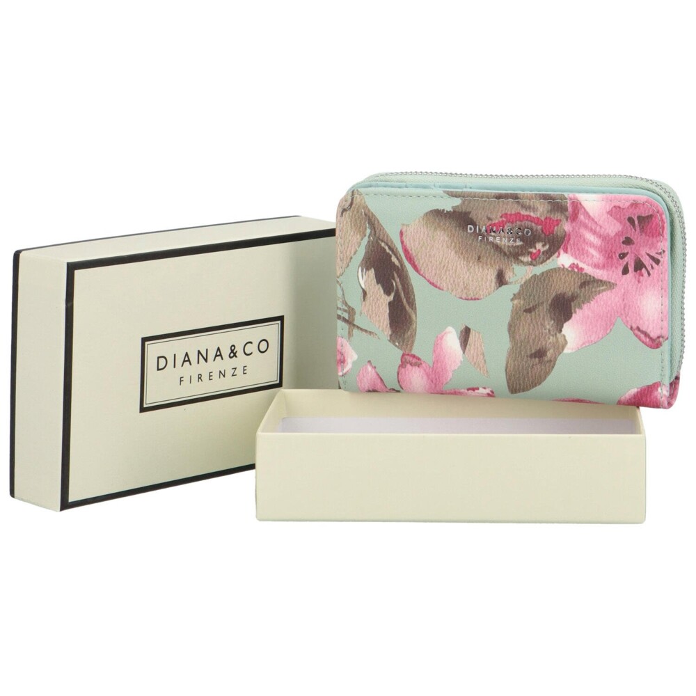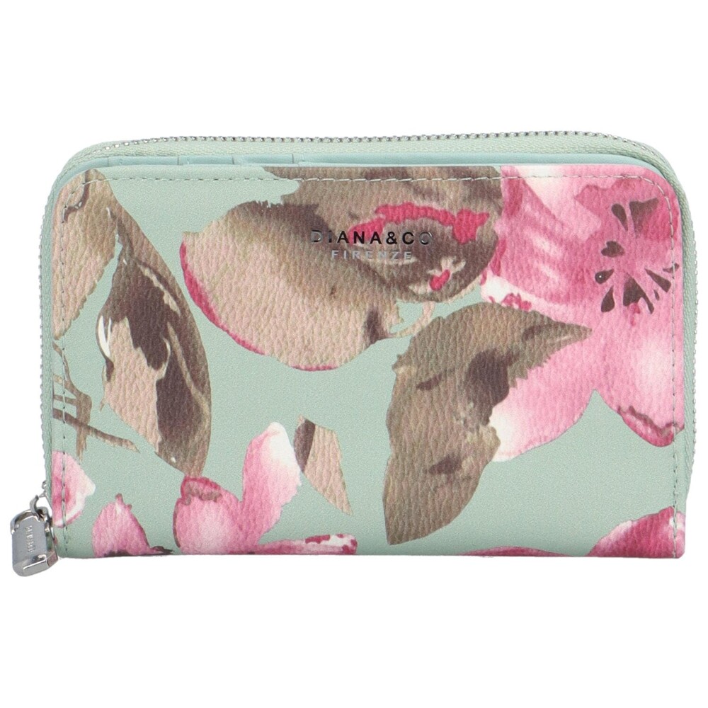 Dámska bledo zelená peňaženka s kvetinovým vzorom od značky DIANA & CO . Objednajte ešte dnes a vyskúšajte, vrátiť ho môžete až za 30 dní! Menšia až stredne veľká peňaženka má dve časti. Jedna časť je na zips, vo vnútri sú priehradky na doklady a vrecko so zipsom na mince. Druhá časť sa otvára pomocou kovového cvočka a tu nájdete vrecko na bankovky a priehradky na kreditné karty a vizitky.