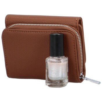 Malá hnedá dámska peňaženka je ideálna do každej malej kabelky. Peňaženka je menšia, praktická a z príjemnej syntetickej kože. Po otvorení cvoku nájdete priestor pre vaše platobné karty a vaše doklady, nájdete tam aj priestor pre vaše bankovky. V druhej časti je zips, ktorý po otvorení ponúka vrecko na mince. Peňaženka má na prednej strane malé logo značky Coveri. Tak objednajte ešte dnes a vyskúšajte! Vrátiť ju môžete do 30 dní.