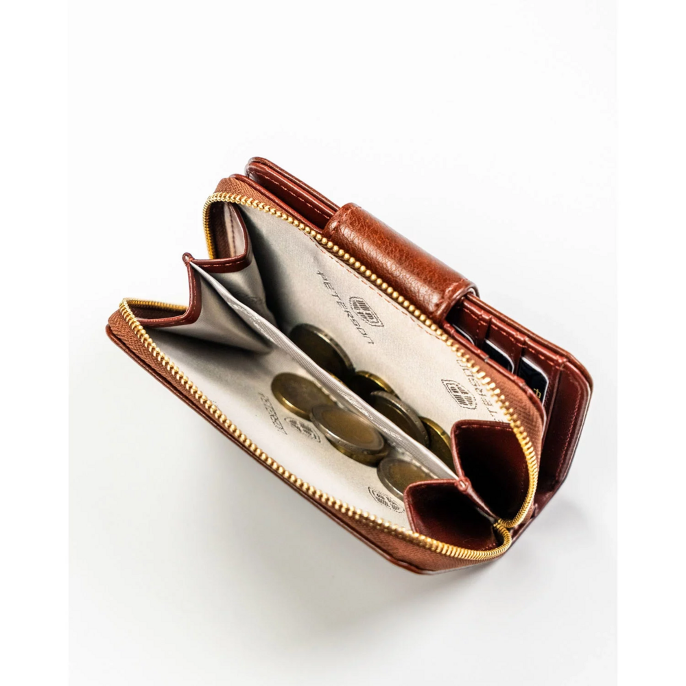 Štýlová menšia peňaženka Peterson, ktorá vás očarí svojim lesklým povrchom a elegantnou zápinkou na prednej strane. Logo značky je umiestnené tak, aby hneď upútalo pozornosť a dodalo peňaženke moderný vzhľad. Vnútri nájdete premyslený priestor pre vaše karty aj papierové bankovky, vďaka ktorému budete mať všetko dokonale usporiadané. Zadná časť peňaženky ponúka samostatné zipsové vrecko na mince. Celkový dizajn podčiarkuje zlaté kovanie a samozrejmosťou je aj RFID ochrana pre bezpečie vašich platobných údajov. Peňaženka je zabalená v elegantnej darčekovej krabičke, takže poteší nielen vás, ale aj kohokoľvek, komu ju venujete. Ojednajte ešte dnes a vyskúšajte, vrátiť ju môžete do 30tich dní.