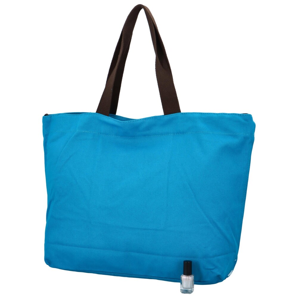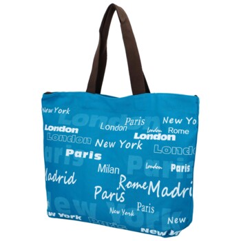 Dámska látková taška na pláž - plážová kabelka cez rameno, s dlhým uchom a moderným designom s nápismi na svetlo modrom podklade. Otvára sa pomocou zipsu a vo vnútri nájdete vrecko na zips na drobnosti, telefón či doklady. Taška ponúka priestor a trendy vzhľad. Práve vďaka tomu ju možno využiť aj v lete ako nákupnú tašku alebo kabelku do mesta!