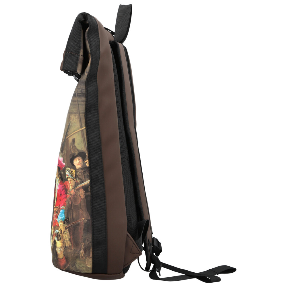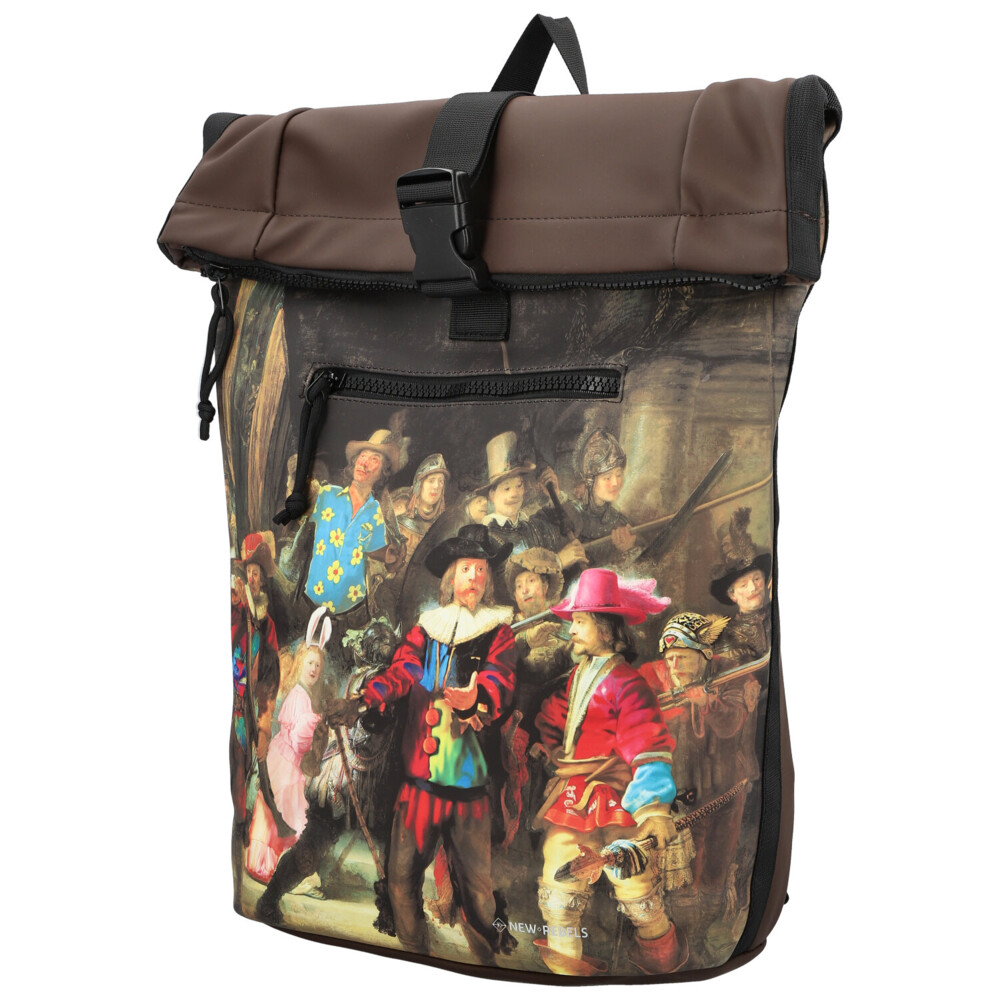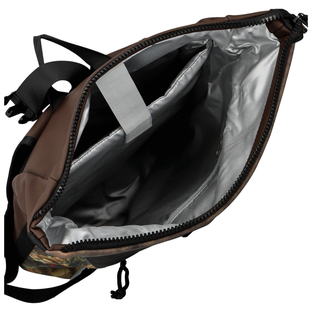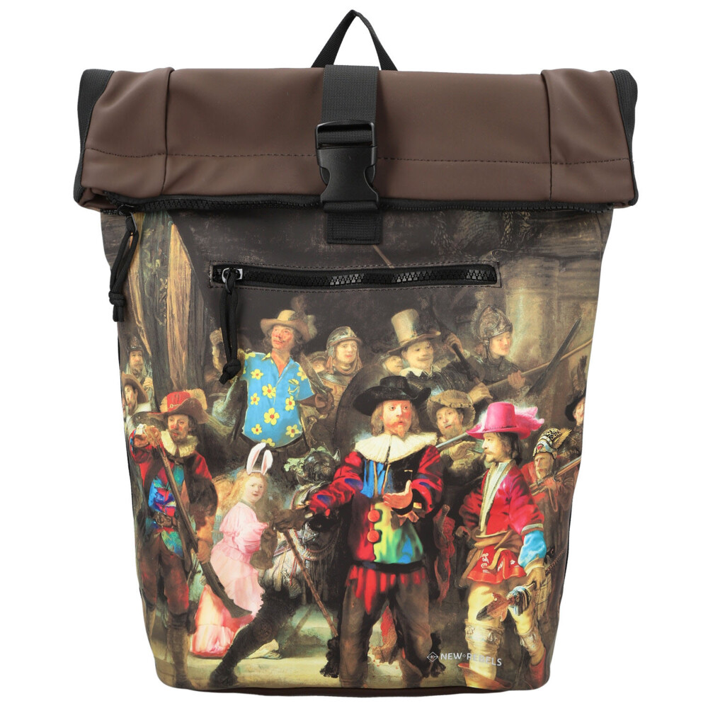 Hnedý roll-on batoh New Rebels kombinuje nadčasový mestský štýl s umeleckým nádychom. Prednú stranu zdobí detailná napodobenina slávneho historického obrazu, ktorá batohu dodáva originálny a výrazný vzhľad. Horná časť sa uzatvára rolovaním a zipsom, čo spoľahlivo chráni obsah pred okolitými vplyvmi. V hlavnom vrecku nájdete praktickú priehradku na notebook, ideálnu pre každodenné pracovné či študijné povinnosti. Menšie zipsové vrecko na prednej strane ponúka miesto na drobnosti, ktoré chcete mať okamžite po ruke. Polstrované ramenné popruhy zaisťujú pohodlné nosenie aj pri dlhšom pohybe po meste. Štýlový batoh vhodný na každý deň, ktorý vás zaujme svojou praktickosťou aj designom. Objednajte ešte dnes a vyskúšajte, vrátiť ho môžete až do 30 dní!
