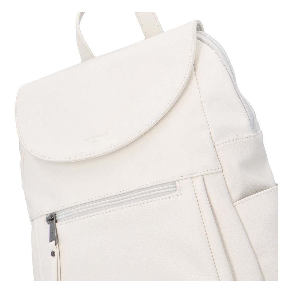 Ponúkame vám len to najlepšie! Zakúpte stredne veľký batoh od značky Hexagona pre seba alebo ako darček, nebudete ľutovať. Hodiť sa bude slečnám aj ženám, do mesta, na prechádzky, do práce či na krátke výlety a cesty. Tento mäkký batoh zo syntetickej kože je bielej farby a má módny, štýlový dizajn so štipkou elegancie. Do hlavnej kapsy, ktorá sa otvára zaobleným duálnym zipsom, sa dostanete cez chlopňu s magnetickým nitom. Praktickým úložiskom na drobnosti je vrecko so zipsom a jazdcom s koženkovými pásikmi na prednej strane. Hlavný priestor je veľký, chýbať vám tu nebudú dve voľné kapsičky na telefón a kľúče, ani kapsička so zipsom na cennosti alebo kozmetiku. Na bokoch batôžku objavíte menšie voľné vrecká napríklad na desiatu alebo zložený dáždnik. Objednajte ešte dnes a vyskúšajte! Vrátiť ju môžete až za 30 dní!