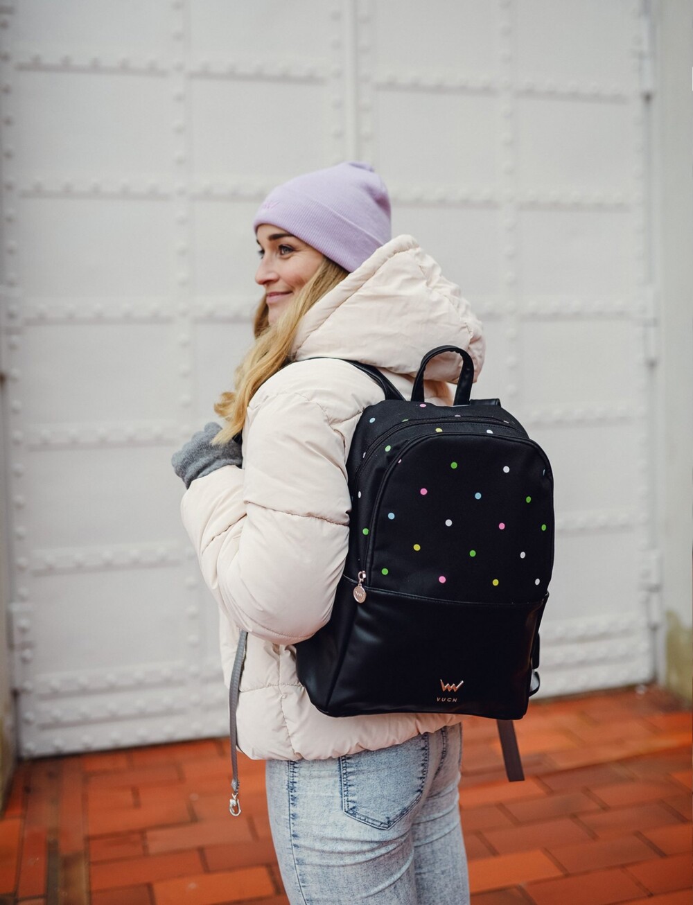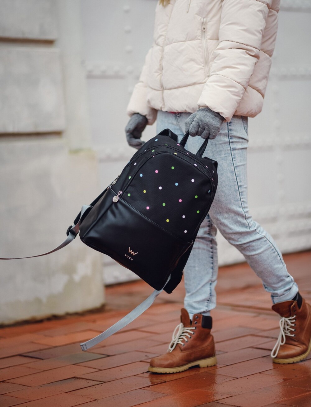 Novinka od značky VUCH je hravý bodkovaný batoh pre všetky príležitosti, ktorý okamžite rozsvieti každý outfit. Tento batoh je elegantným doplnkom ako do mesta, do školy, tak aj na prechádzku, alebo na výlet. Štýlový mix syntetickej kože a textílie dodáva batohu moderný vzhľad a zároveň zaisťuje príjemné nosenie aj každodennú praktickosť. Hlavné veľké vrecko na zips ponúka dostatok priestoru a je šikovne doplnené o oddelené vrecko na notebook, takže vaša technika bude bezpečne uložená. V prednej časti nechýba ďalšie zipsové vrecko na drobnosti. Batoh je vybavený pevným uchom do ruky a nastaviteľnými ramennými popruhmi. Trendy bodkovaný design, funkčné usporiadanie a univerzálne využitie. Objednajte ešte dnes a vyskúšajte, vrátiť ho môžete až za 30 dní.