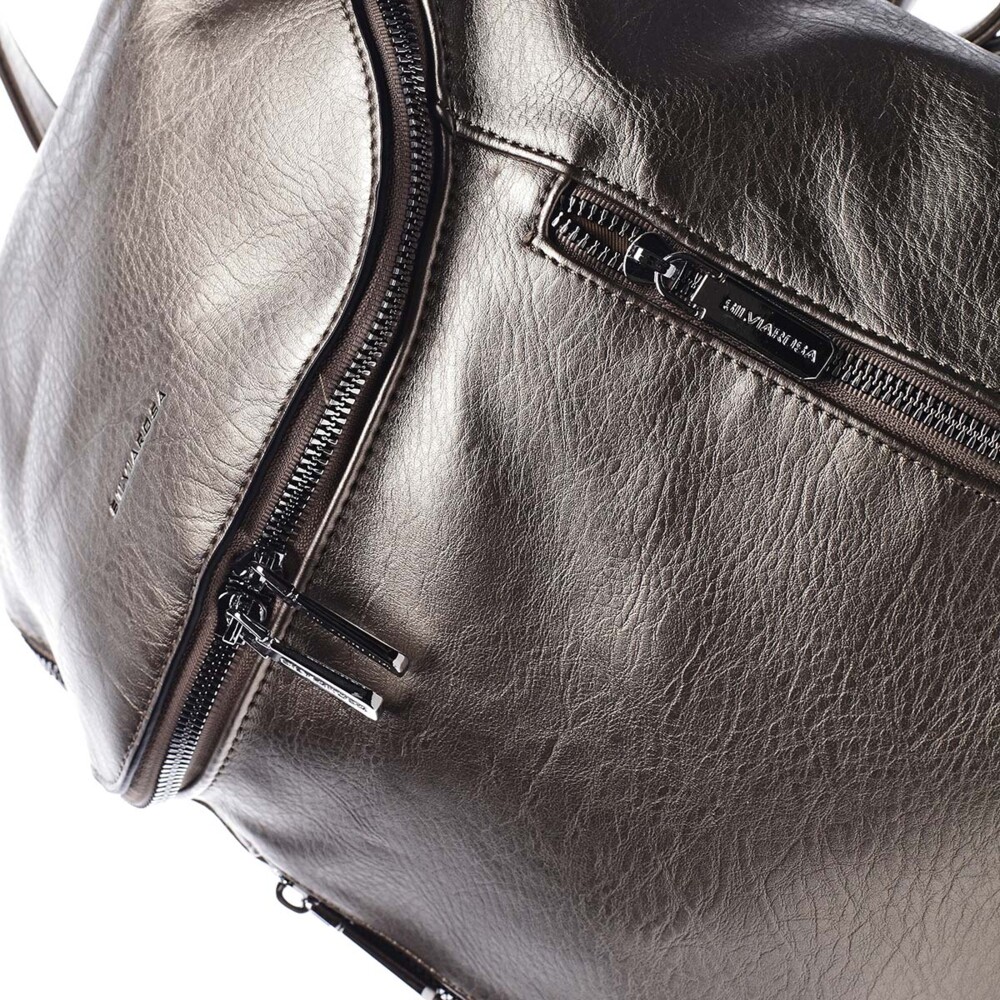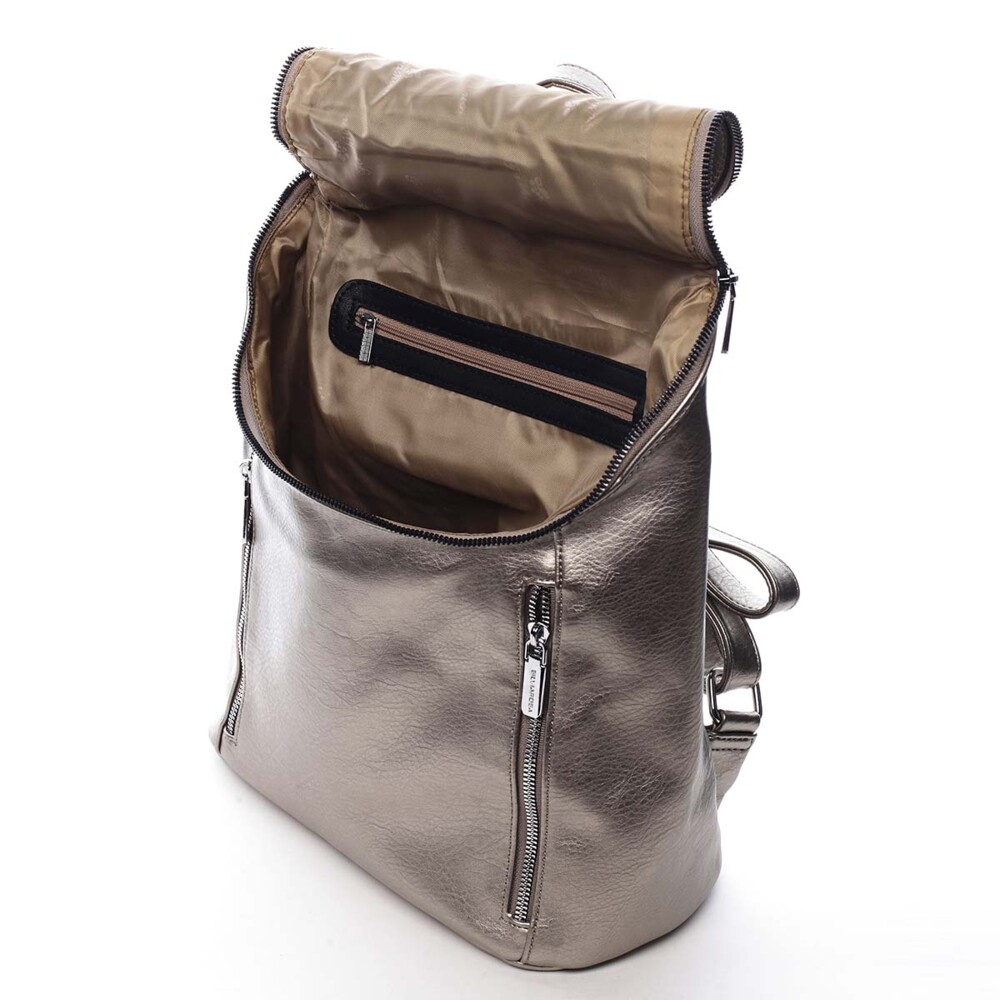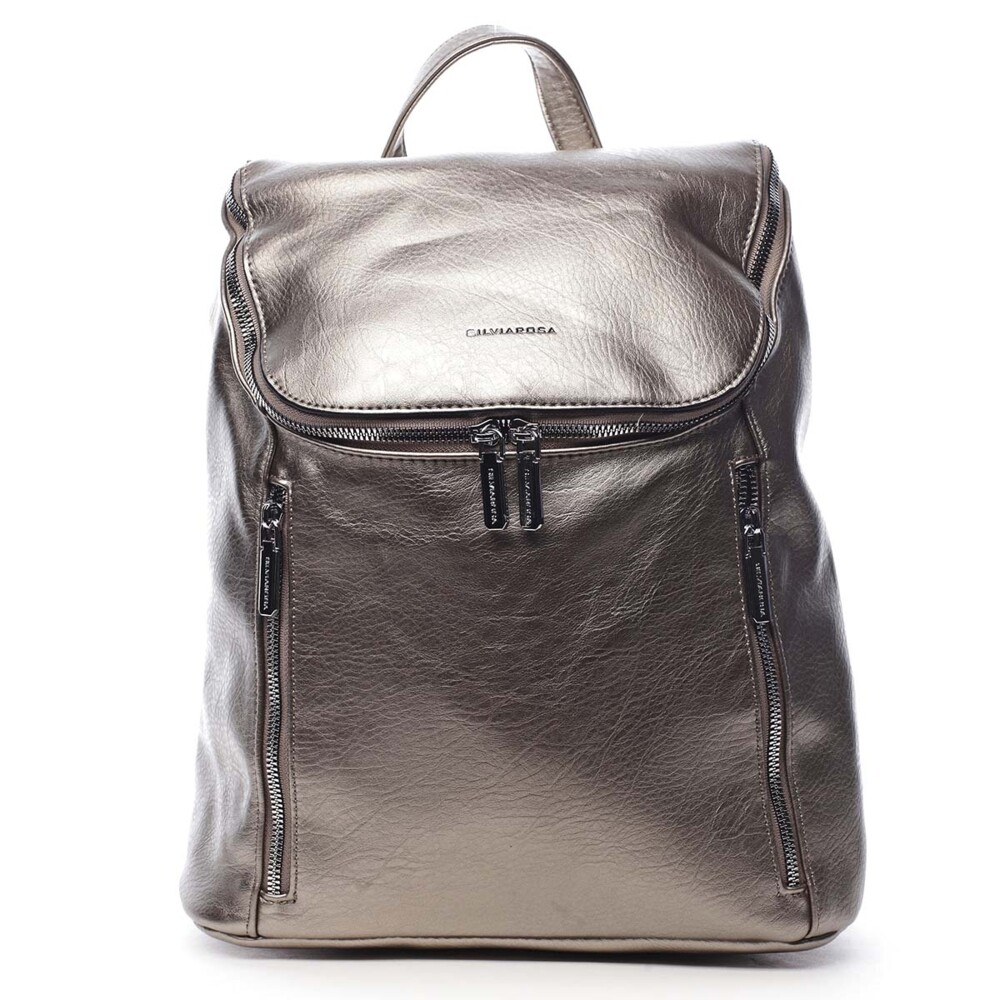 Dámsky, väčší, mestský batoh od značky Silvia Rosa. S týmto moderným bronzovostrieborným kúskom v dave nezapadnete! Objednajte ešte dnes a vyskúšajte, vrátiť ho môžete až za 30 dní! Štýl batohu rozhodne nechýba. Otvára sa akoby klopou so zipsom, ktorý má dva jazdce, vo vnútri sú klasické kapsičky na telefón, kľúče a cennosti. Predná strana zaujme dvoma vreckami, taktiež so zipsami. Chýbať Vám nebude ani vrecko so zipsom na zadnej strane batohu. Celkovo je batoh mäkký, jeho dno je ale pevnejšie.