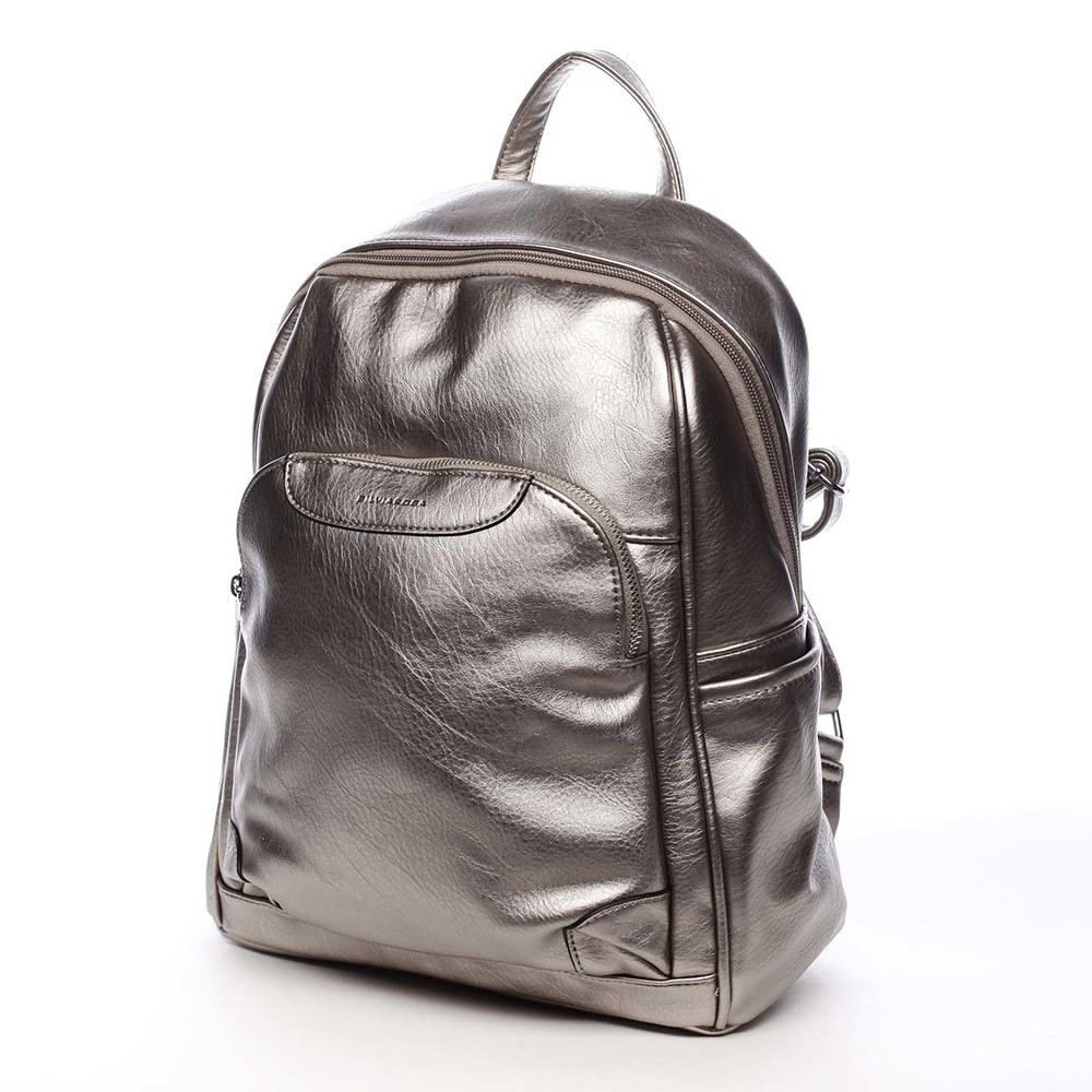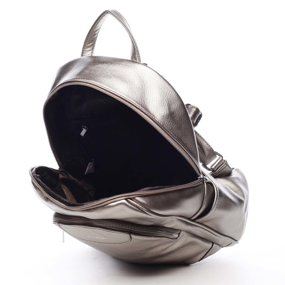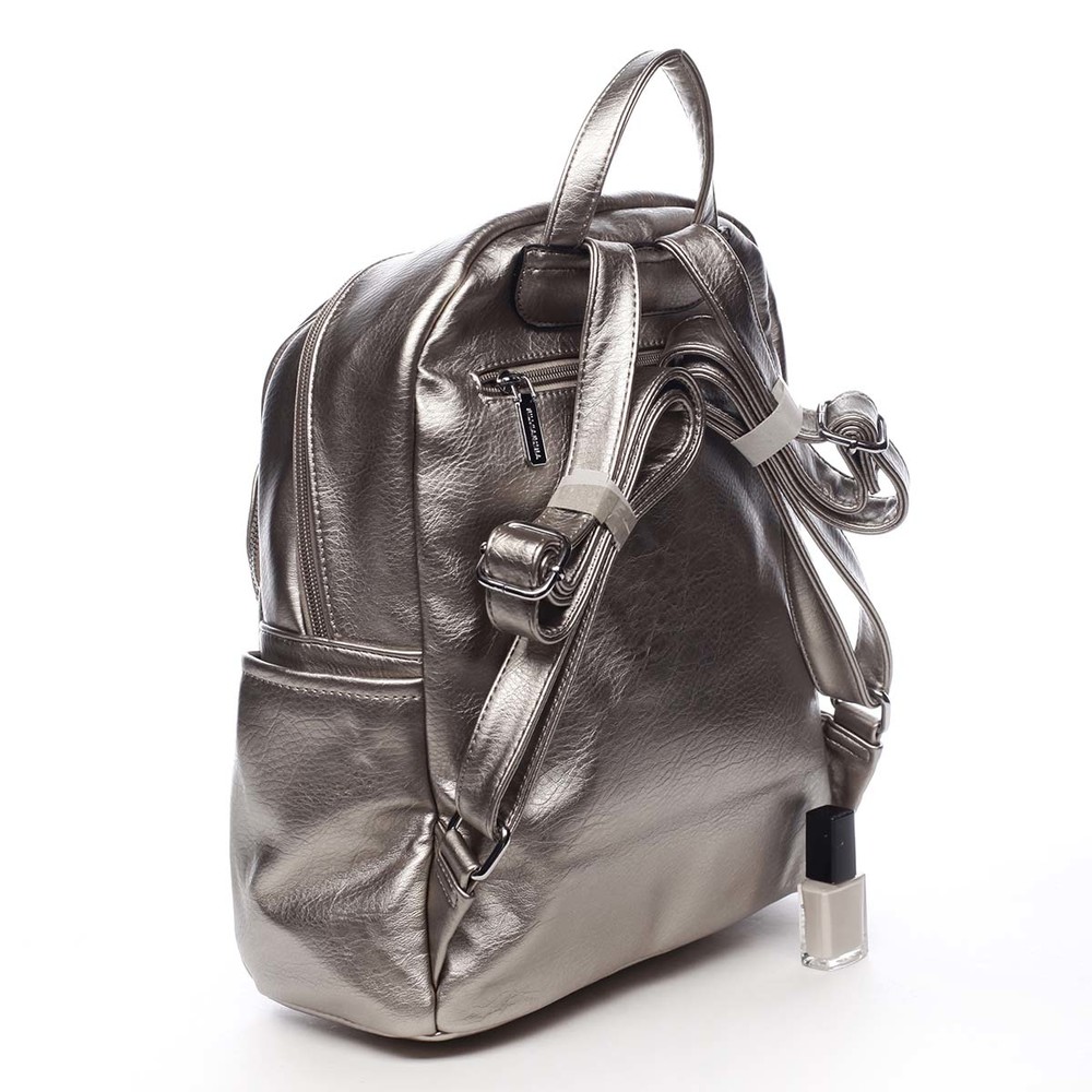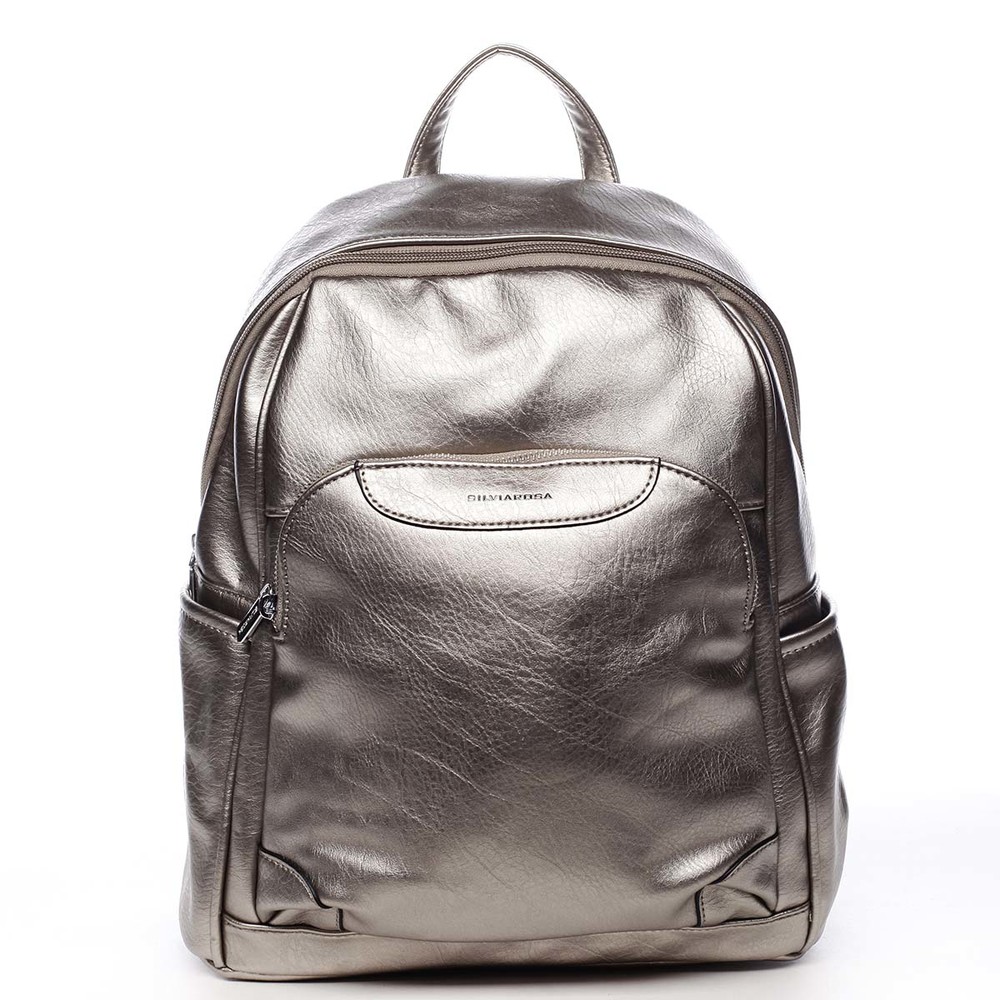 Dámsky, väčší mestský mäkší trendy zlatostrieborný batôžtek Silvia Rosa. Batôžtek je kvalitne spracovaný z mäkkej umelej kože a hodí sa pre dámy aj slečny. Má pevnejšie dno a jeho popruhy sú nastaviteľné. Hlavné vrecko, zaoblené do polovice batohu, sa zatvára zipsom. Vnútri hlavného priestoru sú ďalšie vrecká na drobnosti, dve voľné a jedno so zipsom. Tento trendy batoh pre krásne dni musíte mať. Osvieži váš outfit a zároveň Vám prakticky poslúži pri všetkých činnostiach. Ďalšie vrecká nájdete na bokoch batohu a na prednej i zadnej strane. Objednajte ešte dnes a vyskúšajte, vrátiť ju môžete až za 30 dní!