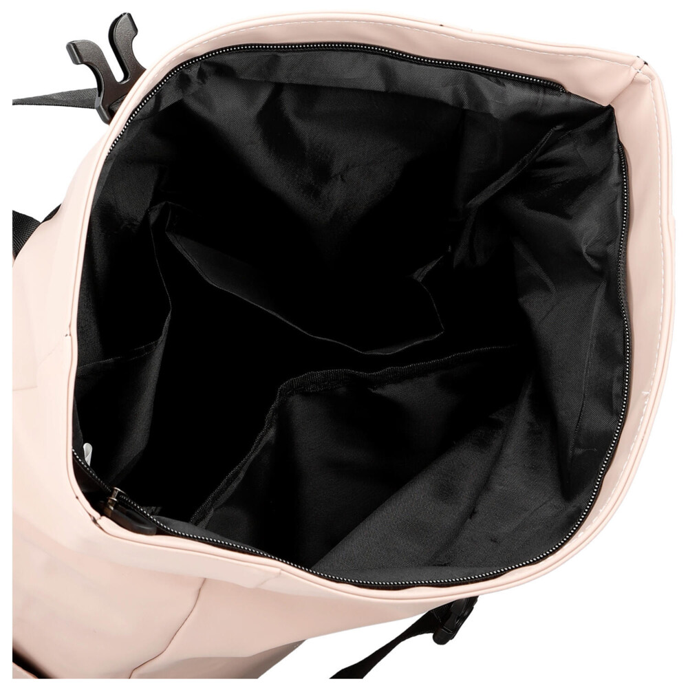 Moderný študentský batoh zo syntetického pogumovaného materiálu, ktorý zaujme štýlovým mestským designom aj vysokou praktickosťou. Trendy farebné prevedenie skvele dopĺňajú čierne detaily, ktoré batohu dodávajú výrazný a súčasný vzhľad. Hlavné vrecko so zapínaním na zips ponúka dostatok priestoru na učebnice aj každodenné nevyhnutnosti. Vnútri nechýbajú praktické vrecká v podšívke. Vrchnú časť je možné jednoducho zrolovať a zaistiť prackou, čo dodáva batohu moderný urban štýl a zároveň možnosť prispôsobiť objem podľa potreby. Prednú stranu zdobia dve výrazné zvislé zipsové vrecká pre rýchly prístup. Po stranách sa nachádzajú dve otvorené vrecká ideálne na fľašu alebo ďalšie drobnosti. Pohodlie pri nosení zaisťujú vypolstrovaný chrbát, nastaviteľné ramenné popruhy a pevné horné ucho pre ľahké prenášanie. Skvelá voľba do školy, mesta aj na voľný čas. Objednajte ešte dnes a vyskúšajte, vrátiť ho môžete až do 30 dní!