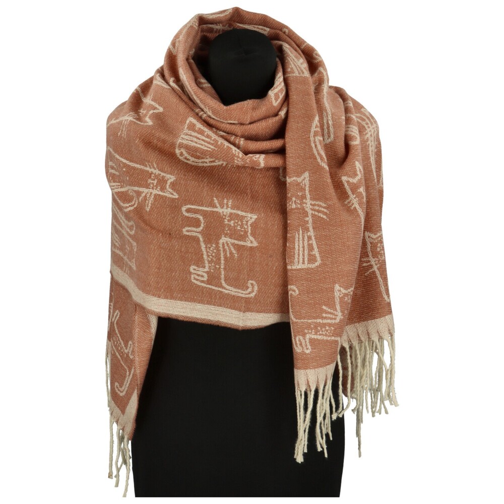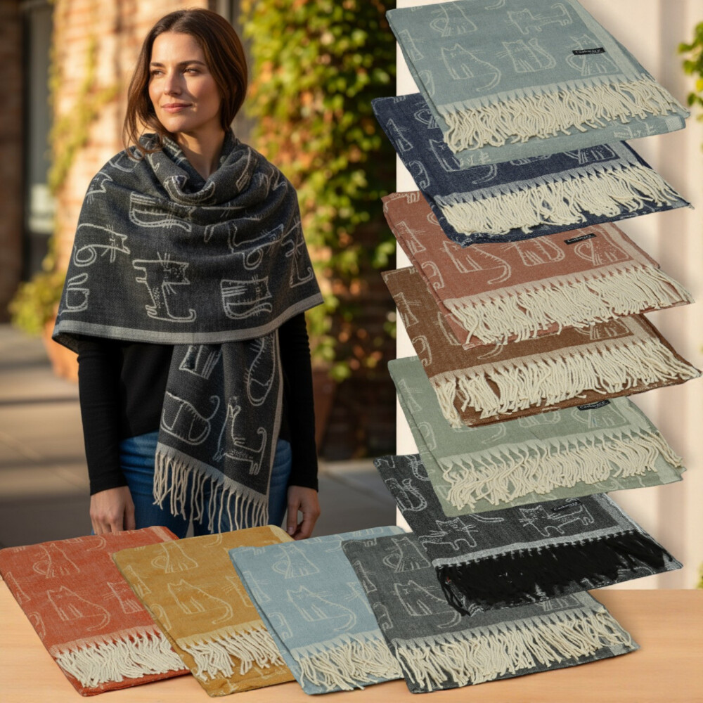 Roztomilý obojstranný šál z kašmíru s prímesou akrylu poteší všetky milovníčky mačiek aj originálnych doplnkov. Po celom šále ju zdobí hravý motív mačiek. Z jednej strany vyniká tmavý podklad so svetlými siluetami, z druhej sa farby obrátia a vzniká jemnejší, svieži efekt. Biele strapce na koncoch krásne kontrastujú s farbami šálu a dodávajú jej ľahkosť aj šmrnc. Mäkká, hebká a hrejivá, ideálny spoločník do chladných dní s nádychom hravej elegancie. Objednajte ešte dnes a vyskúšajte, vrátiť ju môžete až do 30 dní!