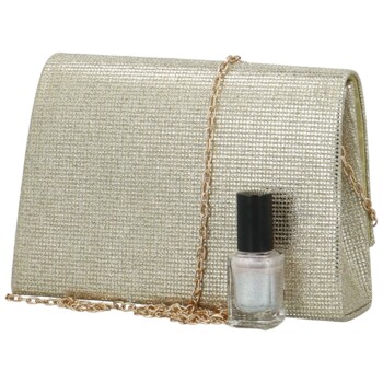 Táto zlatá listová kabelka od Michelle Moon oživí a doplní vaše sviatočné či večerné šaty a každého očarí. Asymetrická chlopňa dodáva kabelke originálny a dynamický vzhľad. Jej povrch je potiahnutý trblietavou látkou. Vnútri kabelky je dostatok miesta na vaše osobné veci. Krásne vám bude sedieť v ruke, ale aj prevesená cez rameno po pripnutí dlhej retiazky. Pevná konštrukcia zaistí, že si kabelka udrží svoj tvar a zároveň pôsobí luxusným dojmom. Má pevné dno, takže bude pevne stáť aj pri odložení. Dokonale doplní elegantný outfit. Objednajte ešte dnes a vyskúšajte! Vrátiť ju môžete až do 30 dní!