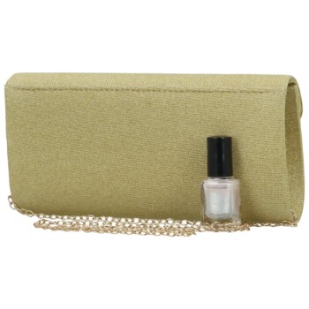 Trblietavá zlatá dámska listová kabelka od značky Michelle Moon na večierky a spoločenské akcie. Skvele sa hodí pre výnimočné okamihy, kedy bezpochyby doplní slávnostné šaty, kostým či kokteilové šaty. Jednoduchá, ale krásne trblietavá dámska plesová kabelka pre Vašu výnimočnú príležitosť. Pod chlopňou na cvok je priestor pre najdôležitejšie veci. Listová kabelka bude vyzerať skvele v ruke aj zavesená cez rameno vďaka dlhej kovovej retiazke. Tento krásny kúsok zdobí trblietavá textília. Objednajte ešte dnes a vyskúšajte! Vrátiť ju môžete až do 30 dní!