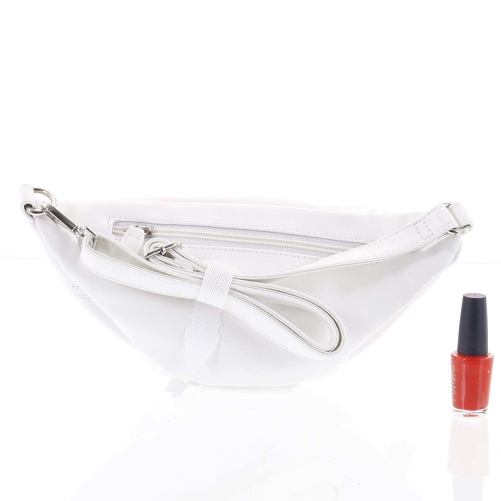 Objednajte túto novinku na trhu ešte dnes, vyskúšajte, vrátiť ju môžete až za 30 dní! David Jones Vám predstavuje dámsku módnu ľadvinku v bielej farbe a jemnom designu. Túto koženkovou kabelku môžete nosiť okolo pása, cez rameno alebo okolo tela, ako je to momentálne v móde. Ľadvinka je akurátnych rozmerov, s kovovými sponami, strapcom u zipsu hlavné vrecká a logom na prednom strane. Popruh je podšitý látkou. Ďalšie dve menšie vrecká so zipsami nájdete na vnútornej i vonkajšej strane strany zadnej.