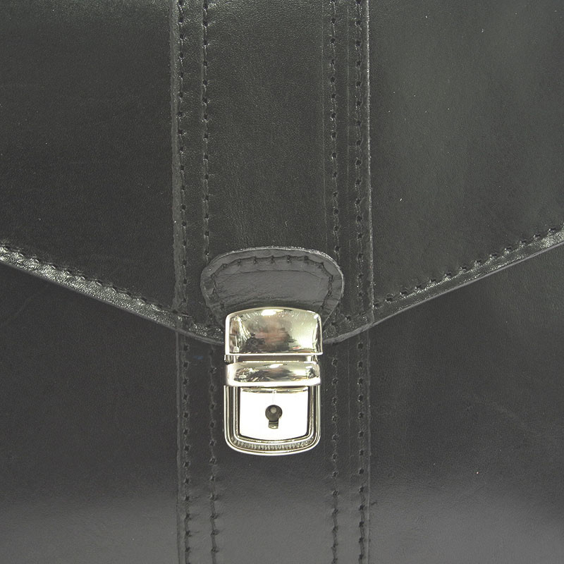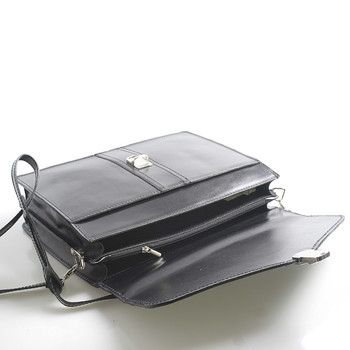 Čierna business unisex kožená aktovka ItalY. Stredná dvoufochová aktovka pre pánov aj dámy. Aktovka má stredné rozmery, je možné použiť ju aj ako diplomatku alebo spisovku, do ktorej sa vojde notebook s maximálnymi rozmermi 30 x 22 cm. Na prednej strane je otvorená kapsa, do ktorej sa zmestí zložka s rozmerom A4. Zozadu je ďalšie vrecko na zips. Aktovka má odnímateľný kožený popruh pre nosenie cez plece. Bestseller 2016.